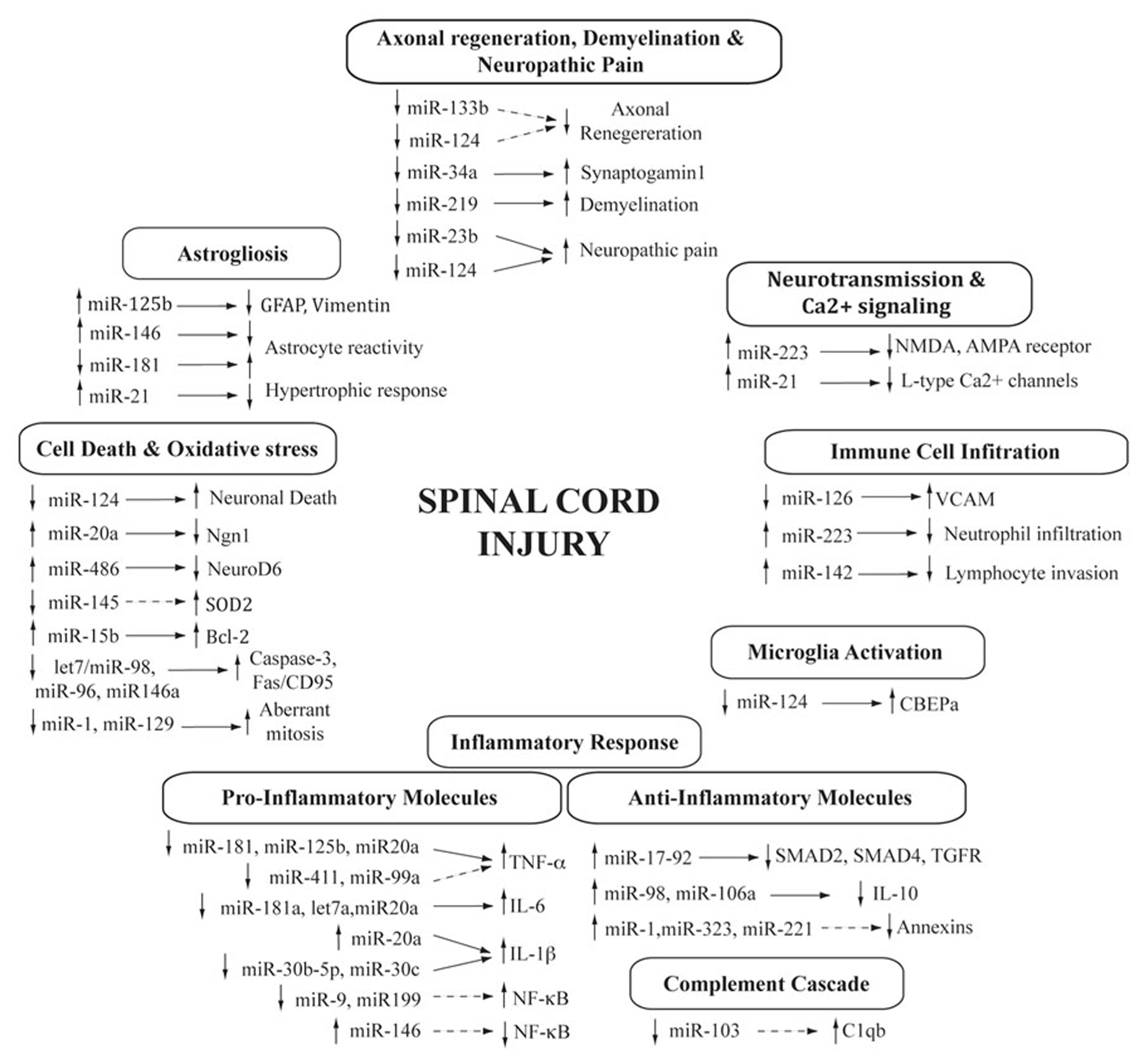 As we have shown in the previous sections, SCI causes profound cellular changes that result from dysregulation of signaling pathways and structural proteins. Alteration of gene expression following SCI is likely accompanied by the post-transcriptional regulation of these modified gene networks. Among the known post-transcriptional regulators, microRNAs have recently attracted much attention due to their ability to inhibit mRNA translation.