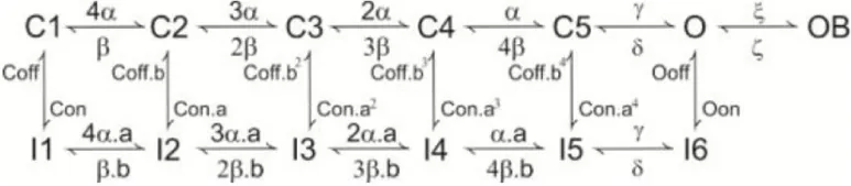 Where V is membrane potential, Cm membrane capacitance, gi are ionic conductances and Vi reversal potentials (the subscript i indicates different channels), and iinj is the injected current. Adjacent compartments communicated through an internal coupling resistance (Diwakar et al., 2009).