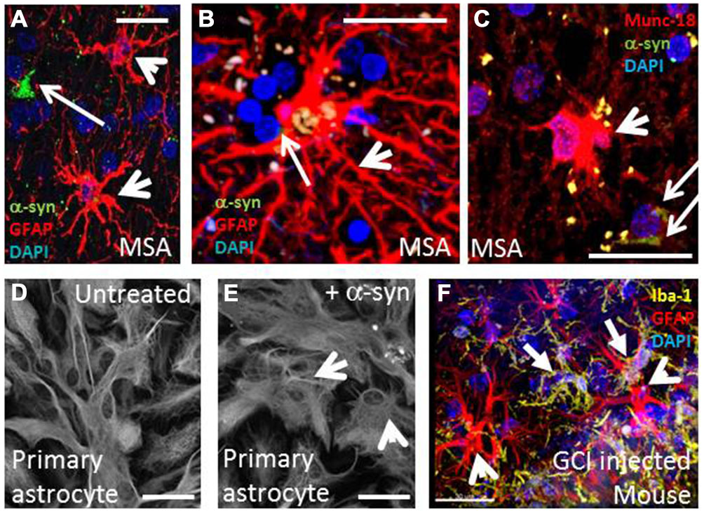 Multiple system atrophy is characterized by widespread oligodendroglial α-syn inclusion bodies, astrogliosis and microgliosis. (A,B) MSA putamen (A) and visual (B) showing activated astrocytes (arrowheads, GFAP, red) in close proximity to GCIs (arrows, α-syn, green). (C) A subset of activated astrocytes are also intensely immunopositive for the exocytic vesicle marker, munc18 (Radford et al., 2015). (D,E) Rat primary astrocyte cells adopt activated morphology when treated with α-syn. (E) compared to control cells (D) Scale bars, 20 μm. (F) Frequent activated microglia (solid arrow, yellow, Iba-1) and activated astrocytes (red, GFAP) occur near to the site of GCI injection in unilateral-lesioned mice (Radford et al., 2015). Scale bar, 30 μm.