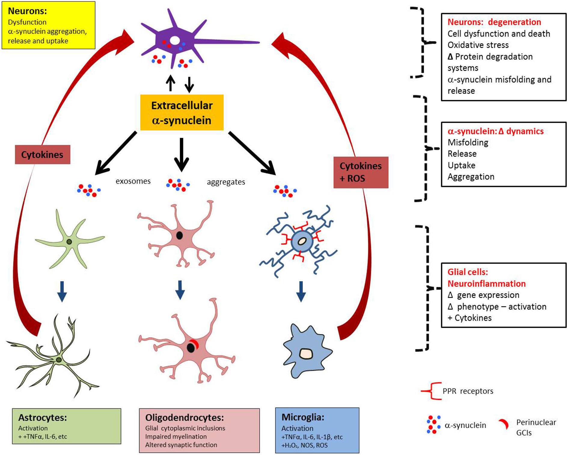 The temporal relationship between astro- and microgliosis in MSA is still poorly understood, as preclinical studies cannot reproduce the long timescale of MSA pathogenesis. Clinical radiology could overcome this limitation but, to date, tagging neuroinflammation with specific markers (Gerhard et al., 2003) has not been performed (Schrag et al., 1998; Schocke et al., 2002; Ozawa et al., 2004; Watanabe et al., 2004; Brooks et al., 2009; Chandran and Stoessl, 2014). Despite limitations related to preclinical and clinical assessment of neuroinflammation, it may be that, because glial cells express no or very little α-syn, glial uptake of α-syn occurs and α-syn triggers the neuroinflammatory process, which may then operate in waves of incremental feed-forward damage. This process, combined with the prion-like behavior of α-syn, implicates the role of neuroinflammation in worsening/perpetuating MSA. Figure 2 represents schematically the interplay between α-syn aggregation and release, astrogliosis and microgliosis and the feedback of pro-inflammatory factors that may in turn result in additional neuronal stress.