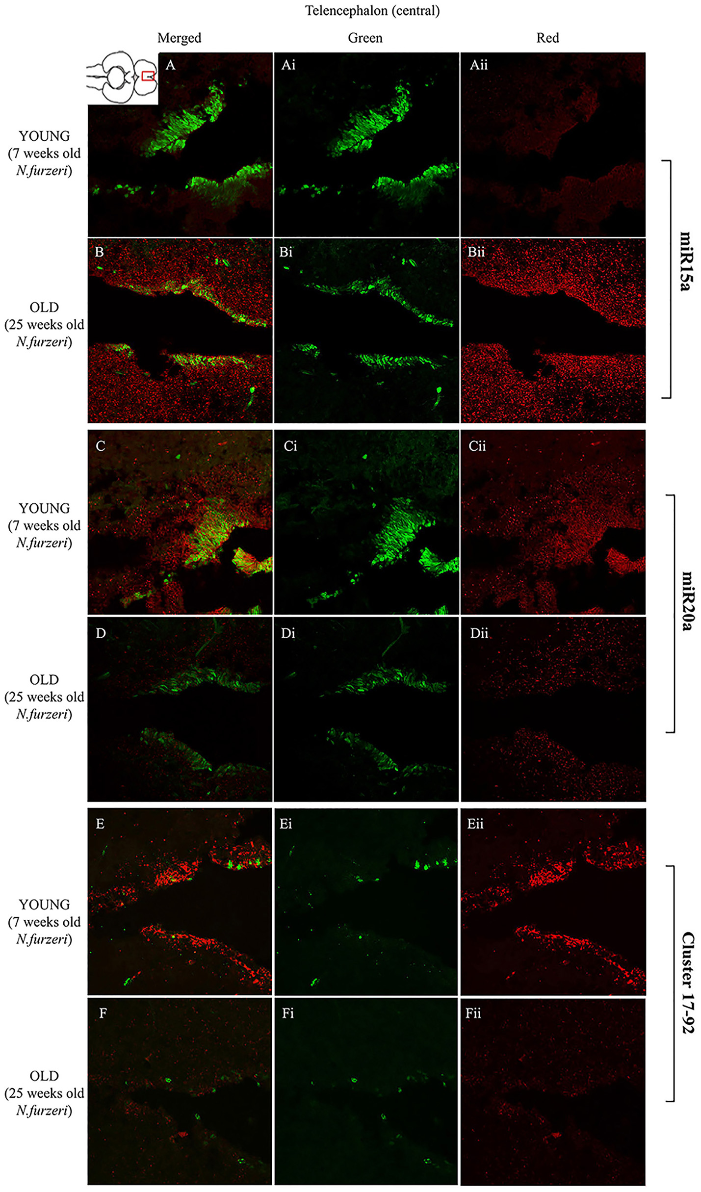 Magnification of the latero-posterior region of the telencephalon (lpTEL) stained in green for PCNA by IHC, and in red for miR15 (A,B strips), miR20 (C,D strips), and Cluster17–92 (E,F strips) by ISH. The lower inset on Aii shows an overview of a horizontal brain section: the location of the lpTEL is indicated by the red rectangle. The left column of the panel (A–F) shows the merged channels for the double staining; A,B refer to ISH for miR15a, respectively, in a young versus an old representative subject. C,D refer to ISH for miR20a, respectively, in a young versus an old representative subject. E,F refer to ISH for Cluster17–92, respectively, in a young versus an old representative subject. Central (Ai–Fi) and right (Aii–Fii) columns show the green and red single channel of the respective image on the left.