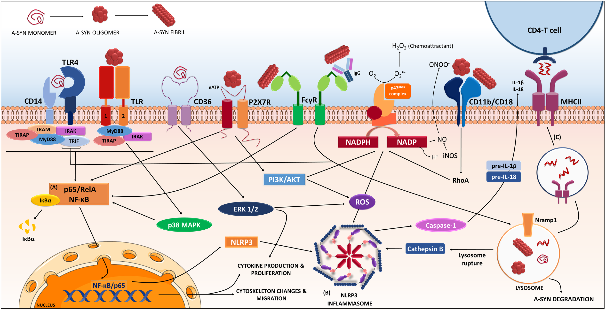 Receptors and proteins involved in the a-synuclein induced response in microglia. The microglia will respond to a-synuclein that might be encountering upon trogocytosis of synapses, but also in the extracellular milieu via exocytosis from neighboring neurons. The type of a-synuclein will change as the disease progresses, thus microglia will encounter, i.e., monomeric, oligomeric, or fibrillar a-synuclein, but also other form such as nitrated, truncated, and phosphorylated a-synuclein (not shown). In addition, a-synuclein might be complexed to other molecules such as IgG. The microglia will recognize, uptake and phagocyte the different a-synucleins, in a process that will be dependent on the type of a-synuclein encountered and the proteins and cascades involved in such event might differ accordingly. Data from multiple labs support the pro-inflammatory character of the event initiated by a-synuclein and thus its ability to act as a DAMP. Such event is the consequence of the interaction of a-synuclein with membrane receptors that lead to the (A) NF-κB activation through several identified mediators, and to (B) assembly of the NLRP3 inflammasome. Altogether, results in the production of inflammatory mediators and free radicals. In addition, proliferation and migration will also occur as a result of these cascades. The microglia will also degrade a-synuclein in a process that, if compromised, can lead to further inflammatory signaling. In parallel the microglia can act as an antigen presenting cell and through the MHC-II system present a-synuclein peptides to CD4-T-cells (C), therefore involving peripheral cells and the adaptive immune system. The resulted immune response will in turn affect neuronal integrity and might also enhance further aggregation of a-synuclein in neighboring cells contributing to disease progression. (Image partially constructed using Servier Medical Art).
