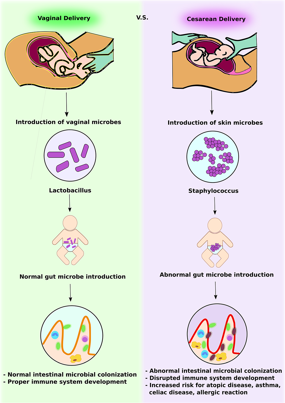 Intestinal microbial introduction by vaginal delivery vs. Cesarean delivery. In vaginal delivery, infants obtain Lactobacillus via the vaginal canal. This promotes normal intestinal microbial colonization and development of a competent gut immune system. In contrast, in Cesarean delivery, infants obtain skin microbes, including Staphylococcus. This abnormal gut microbe introduction leads to altered intestinal microbial colonization and increases the risk of immunologic disorders.