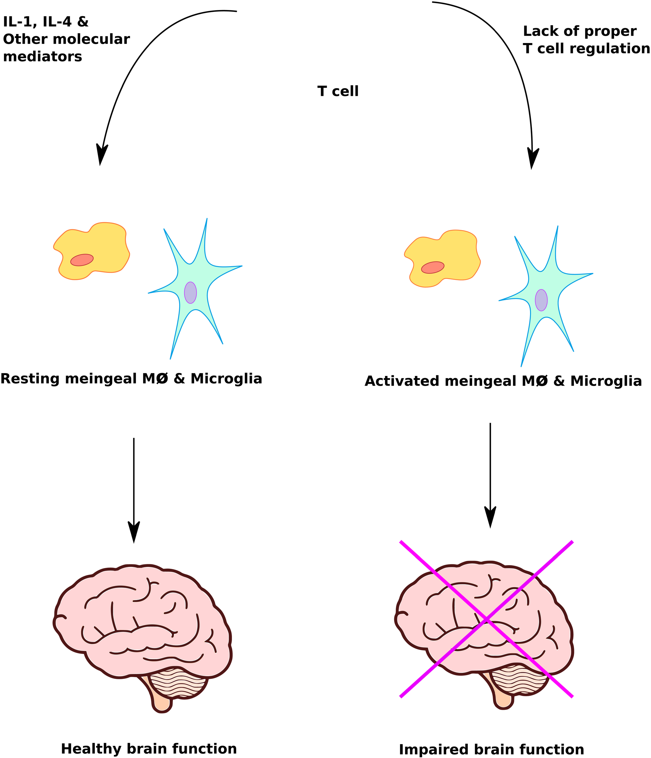 Immune system mediated regulation of brain function. Proper immune system response plays a crucial role in protecting and maximizing brain function. Lack of T cell regulation leads to inappropriate activation of meningeal macrophage and microglia cells, causing impairment of brain function.