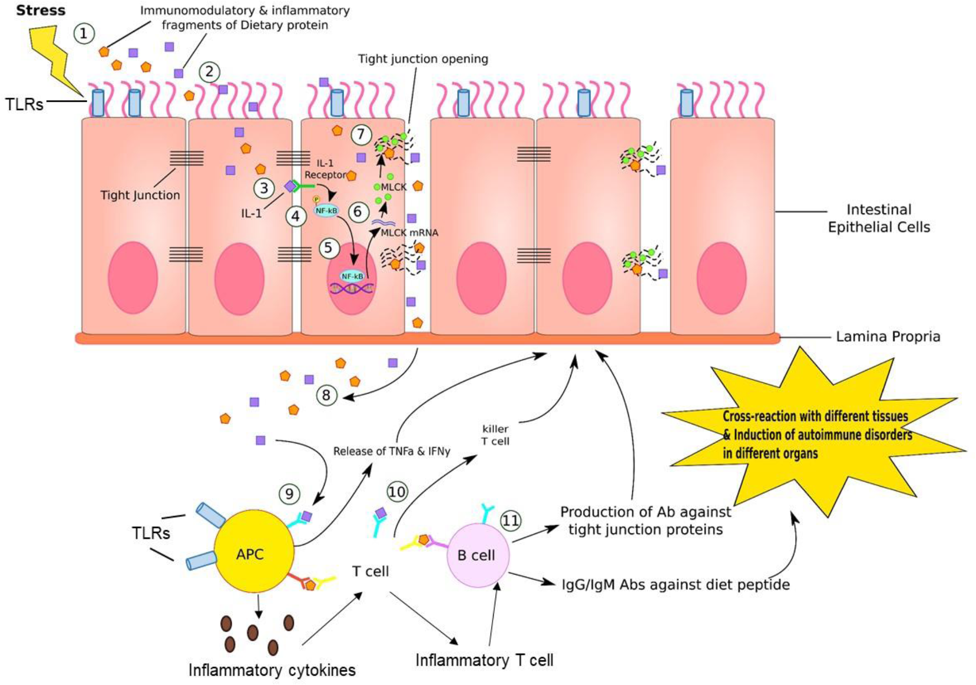 Gut–brain inflammation. (1) Stress, such as medications, neurotransmitters, enzymes, neuropeptides, intestinal flora, or immune dysregulation generates immunomodulatory and inflammatory fragments of dietary proteins. (2) These fragments can diffuse into endothelial cells lining the GI tract. (3) IL-1, which is one of the product of fragment of dietary proteins bind to IL-1 receptor on the lateral border of adjacent epithelial cell. (4) This IL-1/IL-1 receptor complex phosphorylates NF-kB. (5) Activated NF-kB further binds to DNA sequence in nucleus of endothelial cell, inducing transcription of MLCK (myosin-light chain kinase) mRNA. (6) MLCK mRNA travels to cytosol and is translated into MLCK proteins. (7) MLCK proteins bind to and open up the tight junction, where dietary fragment proteins are released into paracellular space. (8) These particles are further released into reticular tissue. (9) APC recognizes this dietary fragment and presents to T cells. (10) T cells generate killer T cell attacking epithelial cells that contain these inflammatory dietary fragments. (11) B cells are activated by T cells presenting the dietary fragment. In response, B cells generate antibodies against tight junction proteins, IgG and IgM antibodies against diet peptides. This leads to cross-reaction in various tissues and induction of autoimmune disorders in different organs. In addition, antigen-presenting cells (APC) such as dendritic cells (DCs) can produce proinflammatory cytokines that educate naive CD4+ T cells into inflammatory T cells that can help B cell maturation to produce antibodies.