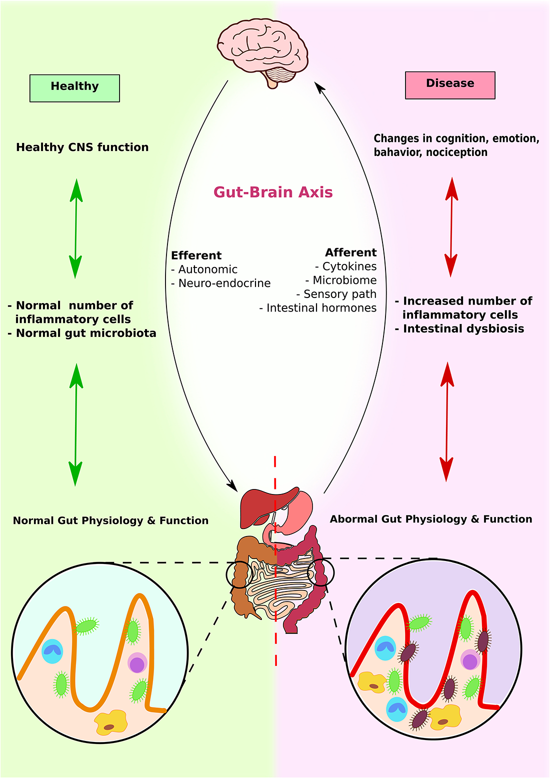 Gut–brain axis and microbiota interplay. Brain, GI system, and microbiota interact with each other to produce physiological responses. In healthy individuals, CNS function enhances normal immune response, which promotes colonization of normal gut microbiota and maximizes GI function. In contrast, in diseased individuals, altered brain functions induce abnormal immune response and intestinal dysbiosis. This further contributes to abnormal gut physiology and function.