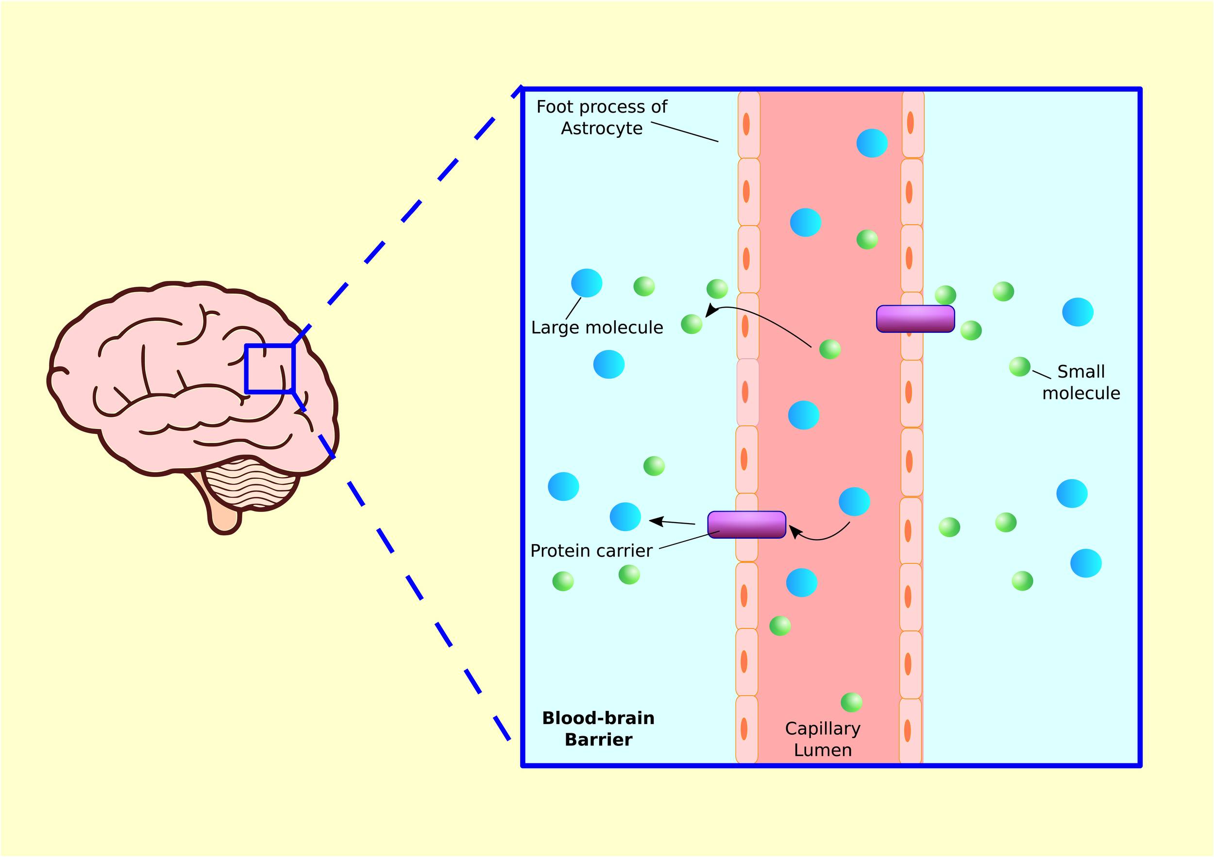 Blood–brain barrier. Blood capillaries are surrounded by astrocyte processes, which enhance transcapillary molecular transport. Small molecules such as gasses or lipid soluble substances in capillary lumen can travel into tissue fluid via diffusion. Larger molecules such as glucose, amino acid, or other hydrophilic proteins are released from brain capillary into tissue via protein carriers.