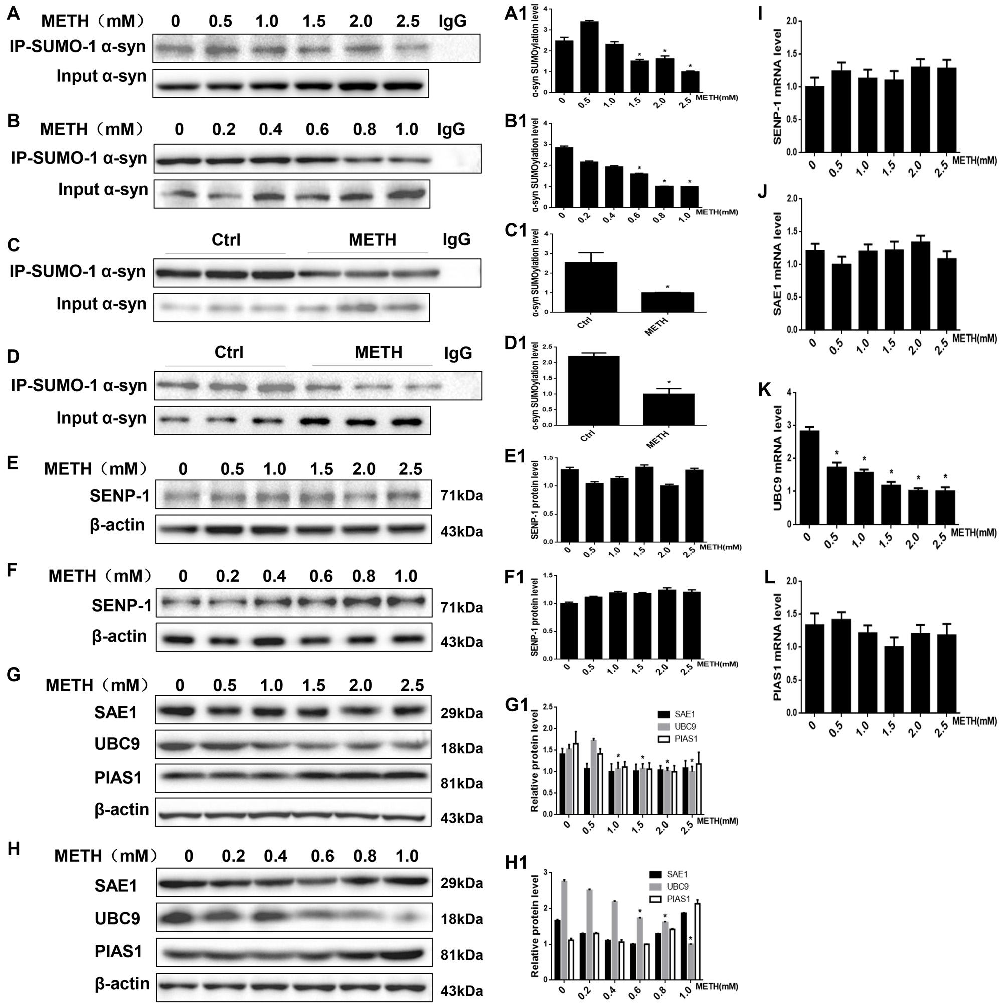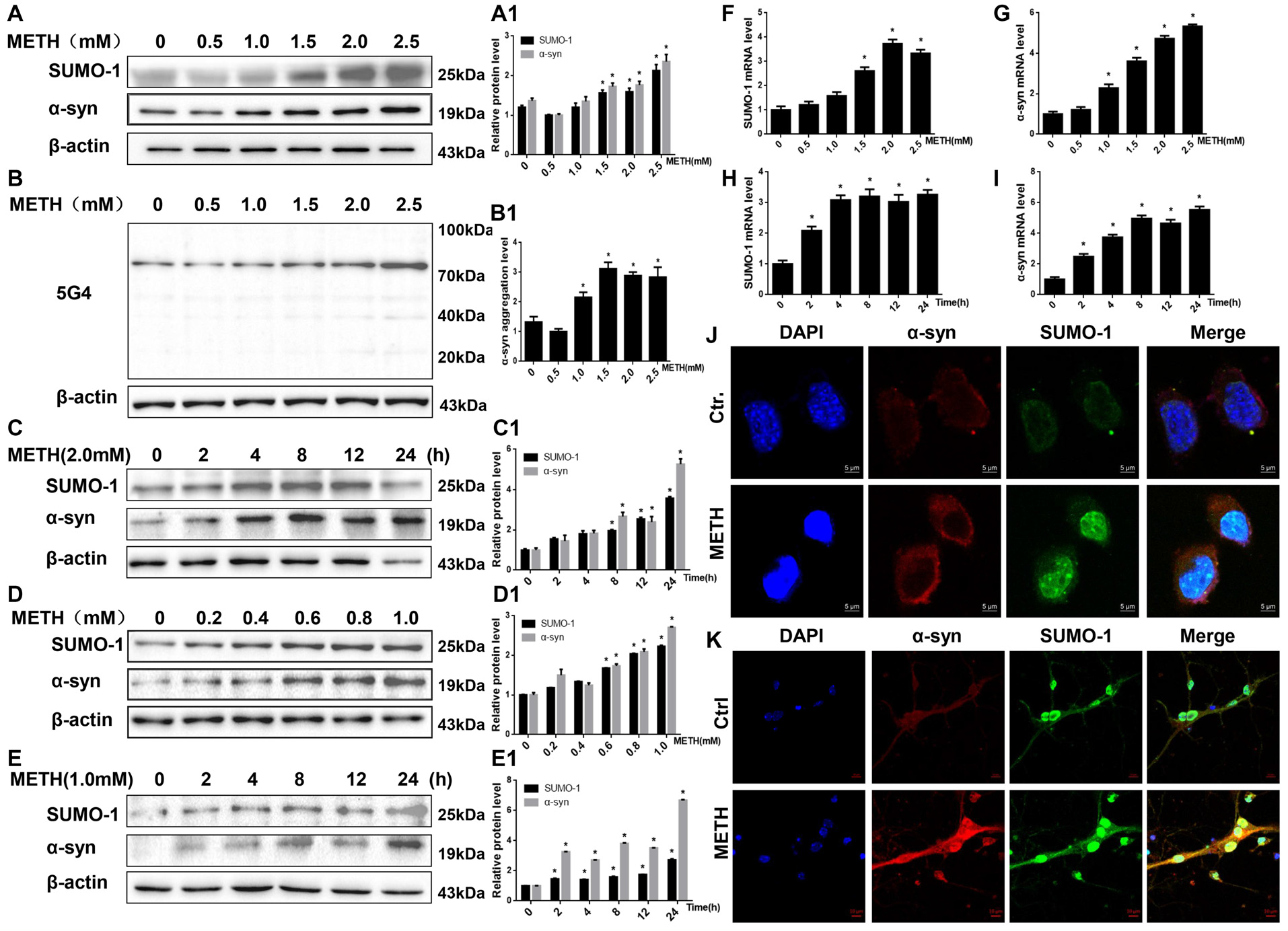 Methamphetamine (METH) increases small ubiquitin-related modifier 1 (SUMO-1) and alpha-synuclein (α-syn) protein expression in vitro. METH exposure up-regulates the protein expression of SUMO-1, α-syn and the aggregation of α-syn in a dose-dependent and time-dependent manner in SH-SY5Y cells and primary cultured neurons. SH-SY5Y cells were exposed to 0.5 mM-2.5 mM METH for 24 h (A,B,A1,B1) and 2.0 mM METH for 2–24 h (C,C1). Primary cultured neurons were exposed to 0.2–1.0 mM METH for 24 h (D,D1) and 1.0 mM METH for 2–24 h (E,E1). Western blot (A–E) and quantitative analyses (A1–E1) were performed to determine the levels of SUMO-1, α-syn and aggregated α-syn. RT-QPCR (F–I) was performed to determine SUMO-1 and α-syn mRNA expression in SH-SY5Y cells. SUMO-1 and α-syn were expressed at higher levels in METH-treated SH-SY5Y cells (2.0 mM, 24 h) and primary cultured neurons (1.0 mM, 24 h) than in the control group, according to analysis with a fluorescence microscope (J,K). SUMO-1 was stained with anti-SUMO-1 antibody (green); α-syn was stained with anti-α-syn antibody (red); nuclei were counterstained with DAPI (blue). β-Actin was used as a loading control. *p < 0.05 compared with the control group. The data shown in (A–I) were analyzed using one-way ANOVA followed by least significant difference (LSD) post hoc analyses.