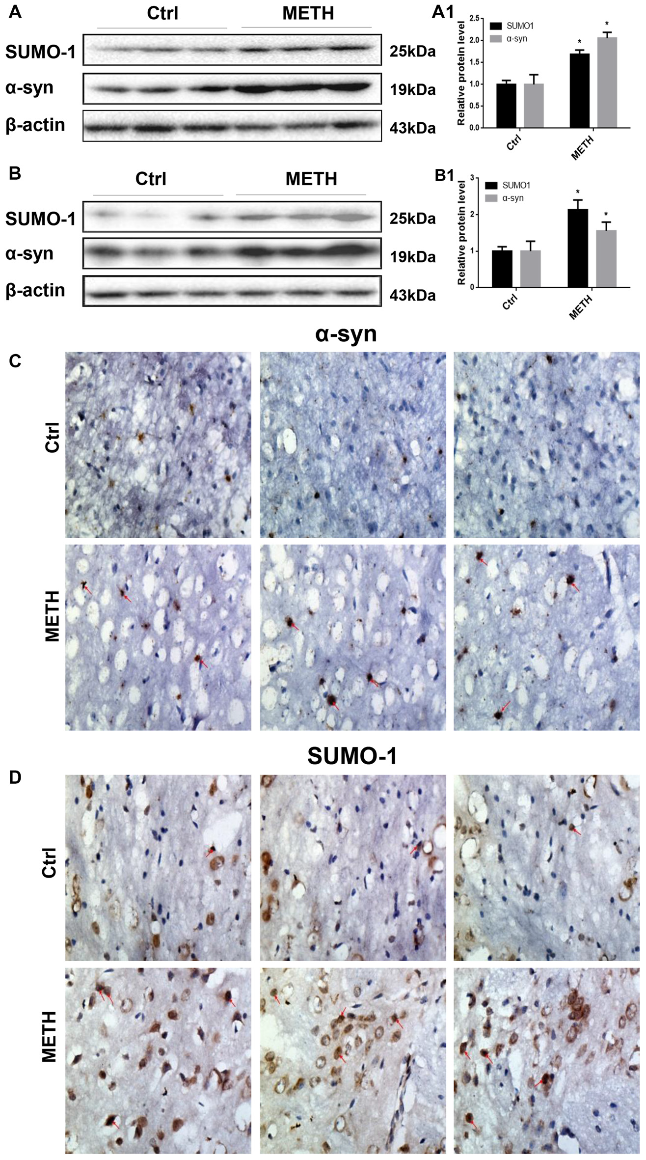 α-Syn is an abundant 140-residue neuronal protein, that is principally located in neuronal presynaptic terminals under physiological conditions, close to synaptic vesicles. Deposits of α-syn have been identified in pathological aggregates, such as LBs and oligodendroglial inclusions, in patients with neurodegenerative disorders (Lee and Lee, 2002; Kahle, 2008; Vekrellis et al., 2011). Recent reports have demonstrated that METH exposure can lead to PD-like LBs in the substantia nigra and striatum of rats (Fornai et al., 2004; Lazzeri et al., 2007), and the major ingredient of LBs is a-syn fibrillization. Moreover, a-syn expression is increased in METH-treated neurons (Ajjimaporn et al., 2007; Chen et al., 2013). Aggregated α-syn contains various recruited factors, including Ub, SUMO, protein chaperones and proteasome components. In this study, we verify that METH induces α-syn overexpression and aggregation in vitro and in vivo, consistent with previous research. In addition, we propose the hypothesis that SUMOylation of α-syn plays a role in METH-induced α-syn overexpression and aggregation.
