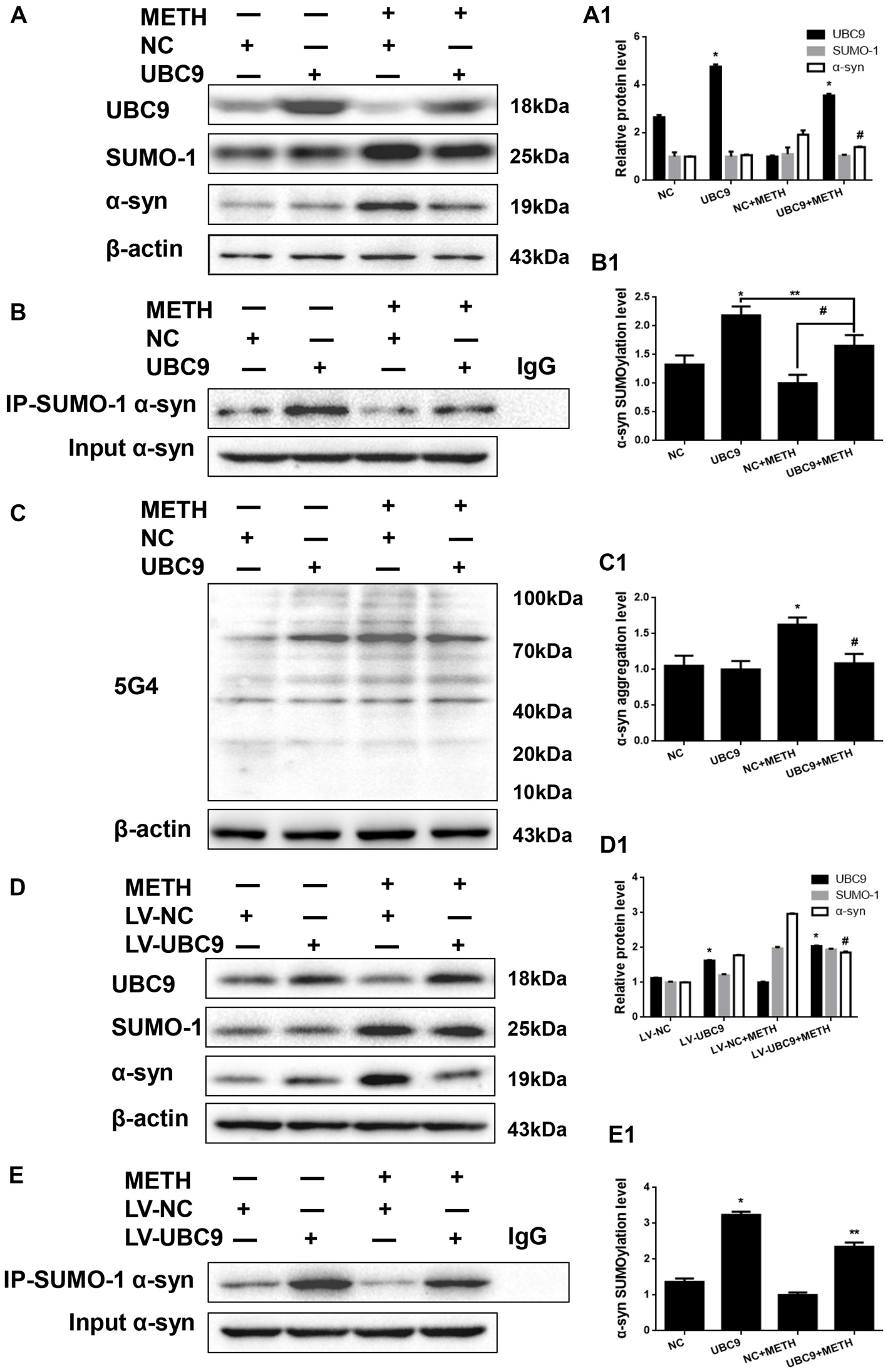 The level of SUMOylated α-syn in METH-treated cells increases when UBC9 is overexpressed. SH-SY5Y cells (A–C,A1–C1) and primary cultured neurons (D,E,D1,E1) were transfected with pcDNA3.1-NC or pcDNA3.1-UBC9 and LV-NC or LV-UBC9, respectively. Cells were treated with or without METH. Then, the cells were immunoprecipitated with an anti-SUMO-1 antibody, followed by western blot with an anti-α-syn antibody. Cells immunoprecipitated with IgG were used as a negative control. Western blot (A–E) and quantitative analyses (A1–E1) were performed to evaluate the efficiency of UBC9 overexpression, the expression of SUMO-1, and the expression, aggregation and SUMOylation of α-syn. β-Actin was used as a loading control. *p < 0.05 compared with the NC group. **p < 0.05 compared with the LV-UBC group. #p < 0.05 compared with the METH-treated NC group. The data were analyzed using one-way ANOVA followed by LSD post hoc analyses.