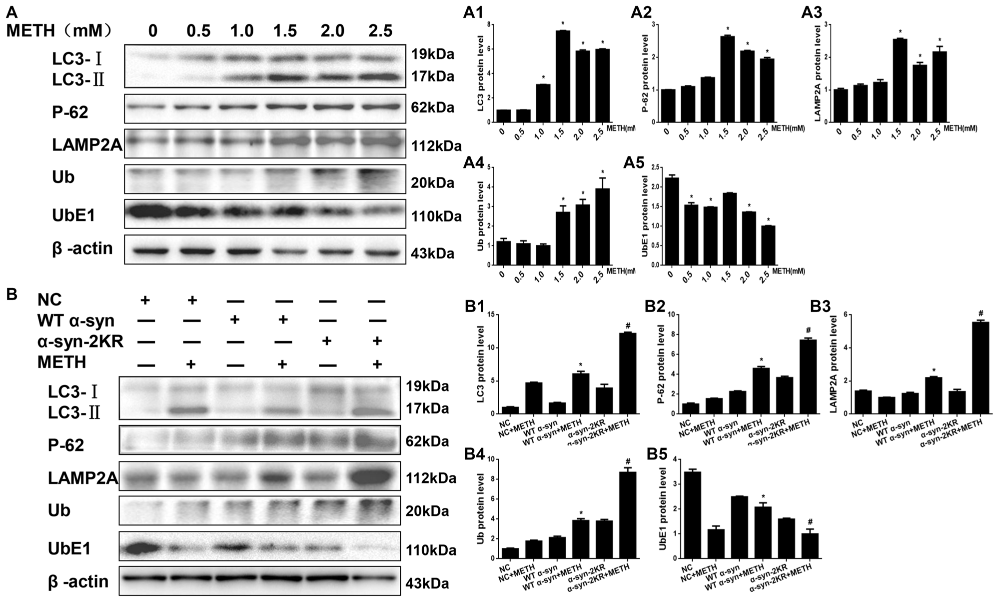 Impaired SUMOylation of α-syn hinders α-syn degradation through the ubiquitin-proteasome system (UPS) and the autophagy-lysosome pathway (ALP). SH-SY5Y cells were exposed to METH in a dose-dependent manner for 24 h (A,A1–A5). SH-SY5Y cells stably expressing GFP, WT α-syn or α-syn-2KR were treated with or without 2.0 mM METH for 24 h (B,B1–B5). Western blot (A,B) and quantitative analyses (A1–A5,B1–B5) were performed to evaluate the expression of UbE1 and Ub, which are involved in the UPS, and of LC3-II, P-62 and Lysosomal associated membrane protein-2 (LAMP-2), which are involved in the ALP. β-Actin was used as a loading control. *p < 0.05 compared with the control or LV-GFP group. #p < 0.05 compared with the METH-treated SH-SY5Y cells stably expressing WT α-syn. Data were analyzed using one-way ANOVA followed by LSD post hoc analyses.