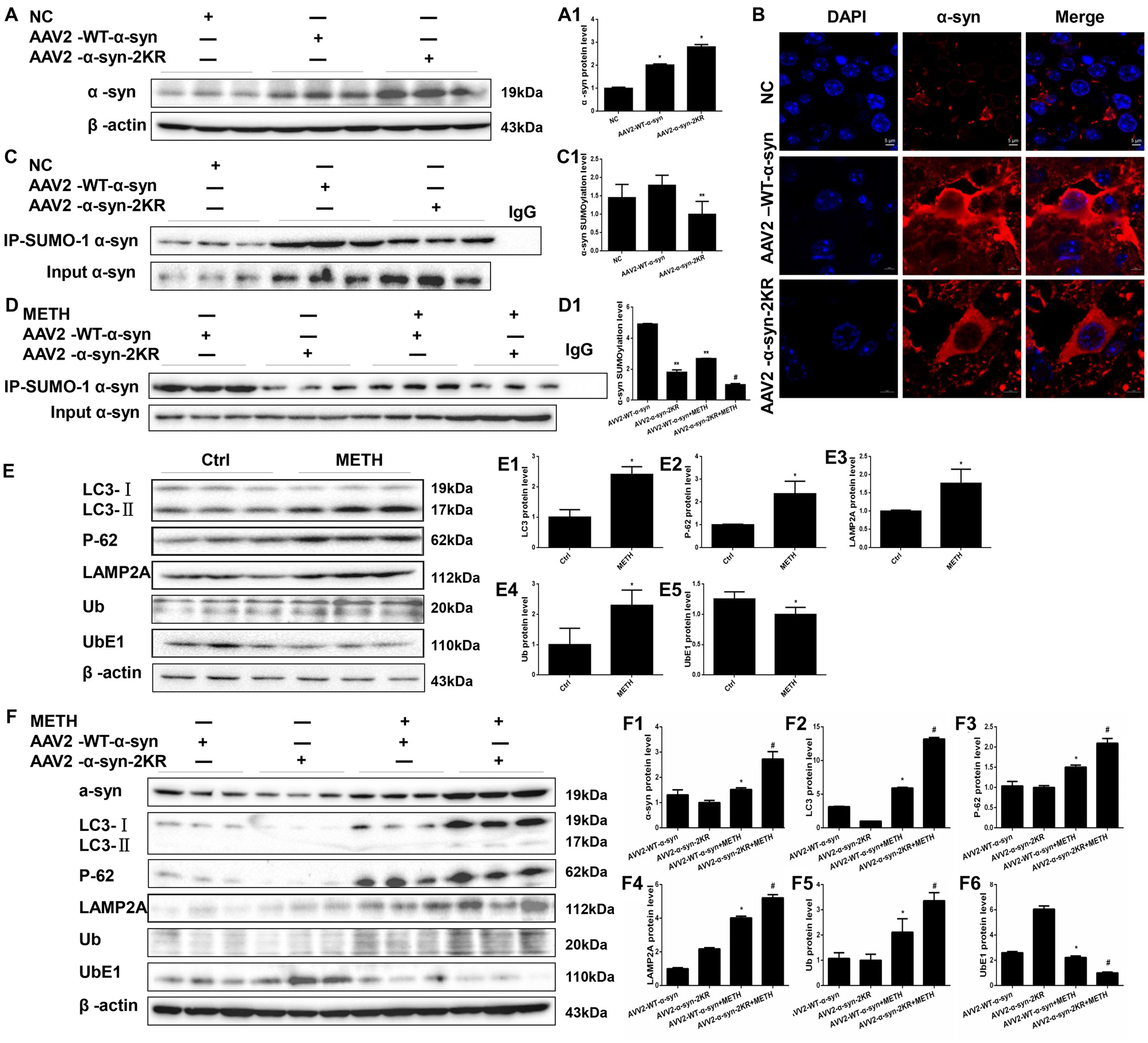 Mutations in the major SUMOylation acceptor sites of α-syn exacerbate METH-induced α-syn aggregation in vivo. Adenovirus were injected into the right striatum of mice using a standard stereotaxic positioning system. After 2 days of recovery, mice received saline or METH by i.p. injection. Striatal tissues (right side) were harvested at 24 h after the injection of the last dose. The tissues were immunoprecipitated with an anti-SUMO-1 antibody, followed by western blot with an anti-α-syn antibody. Tissues immunoprecipitated with IgG were used as a negative control. Western blot (A,C) and quantitative analyses (A1,C1) were performed to evaluate the efficiency of WT α-syn and α-syn-KR expression. Immunofluorescence staining of mouse striatum sections showed that α-syn expression increased after injection of adenovirus (B). Western blot (D–F) and quantitative analyses (D1,E1–5,F1–6) were also performed to the levels of the SUMO-1, UbE1, Ub, LC3-II, P-62 and lysosomal associated membrane protein 2A (LAMP2A) proteins and the expression of SUMOylated α-syn. β-Actin was used as a loading control. *p < 0.05 compared with the AAV2-NC or control group. **p < 0.05 compared with the AAV2-α-syn group. #p < 0.05 compared with the AAV2-α-syn + METH-treated group. The data shown in (A,C,D,F) were analyzed using one-way ANOVA followed by LSD post hoc analyses, whereas the data shown in (E) were analyzed using the Mann-Whitney U test.