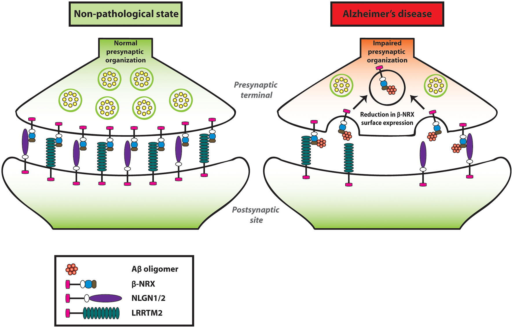 Amyloid-β oligomers (AβOs) impair presynaptic organization by reducing β-NRXs on the axon surface. AβOs bind to the histidine-rich domain (HRD) of β-NRXs. This interaction leads to the reduction of β-NRX surface expression on the axons without interfering with its ability to bind to NLGN1 or LRRTM2. By reducing the surface level of β-NRXs, presumably through enhanced endocytosis, AβOs impair NLGN1/2- and LRRTM2-mediated presynaptic organization.