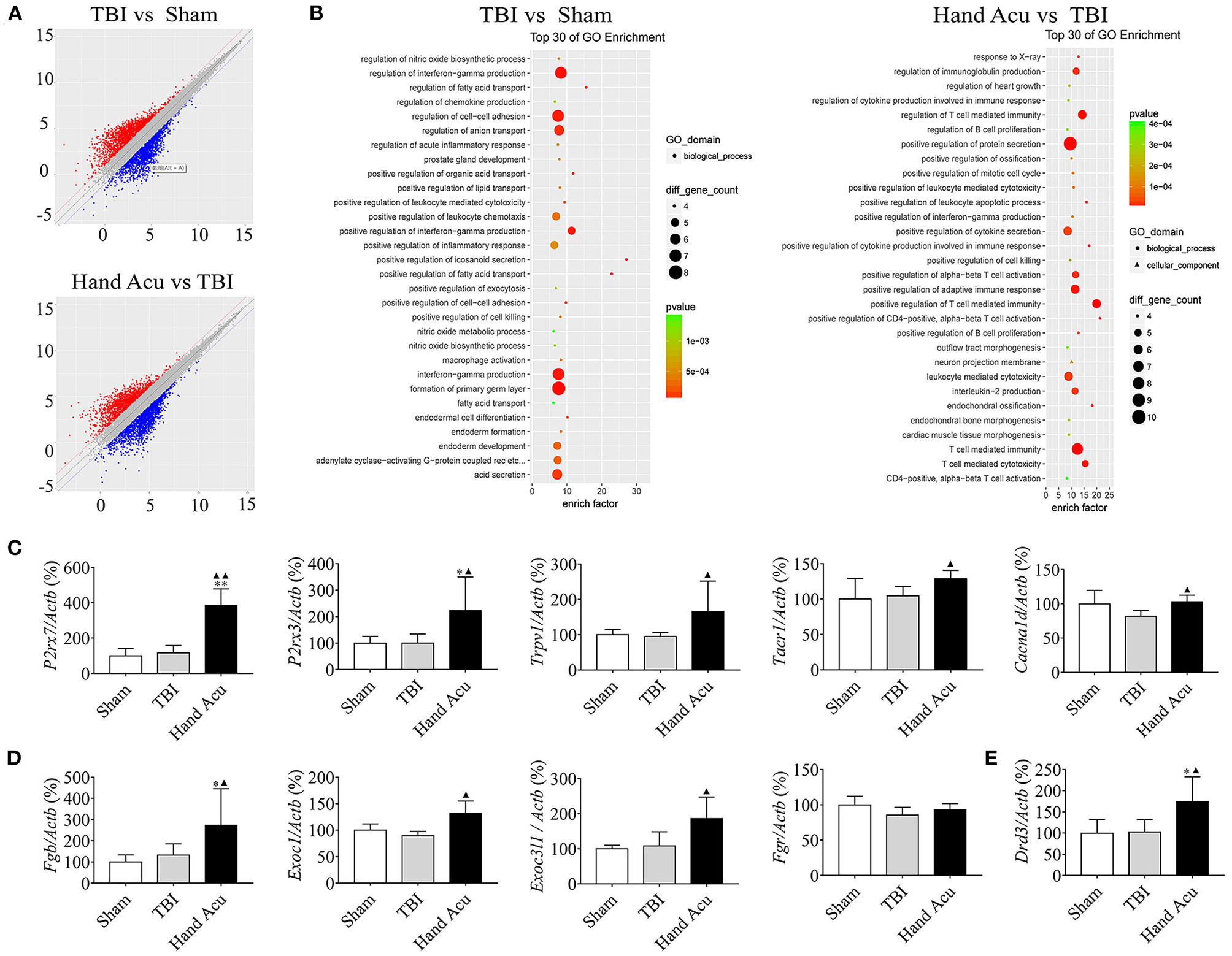 HTWP acupuncture activates the pathways of neural projection and protein secretion in the brainstem. (A) Differential gene scatter plots (red and blue plots represent up- and downregulated genes, respectively). (B) Top 30 of GO enrichment analysis. The larger dots represent higher number of genes. The following genes were analyzed (n = 5/group; one-way ANOVA). (C–E) Quantitative analysis of the gene expression of factors related to (C) neural projections: P2rx7, P2rx3, Trpv1, Tacr1, and Cacna1d or (D) protein secretion: Exoc1, Exoc3l1, Fgb, Fgr, and (E)Drd3. Error bars represent mean + SEM; *P < 0.05, **P < 0.01 vs. Sham; ▴P < 0.05, ▴▴P < 0.01 vs. TBI.