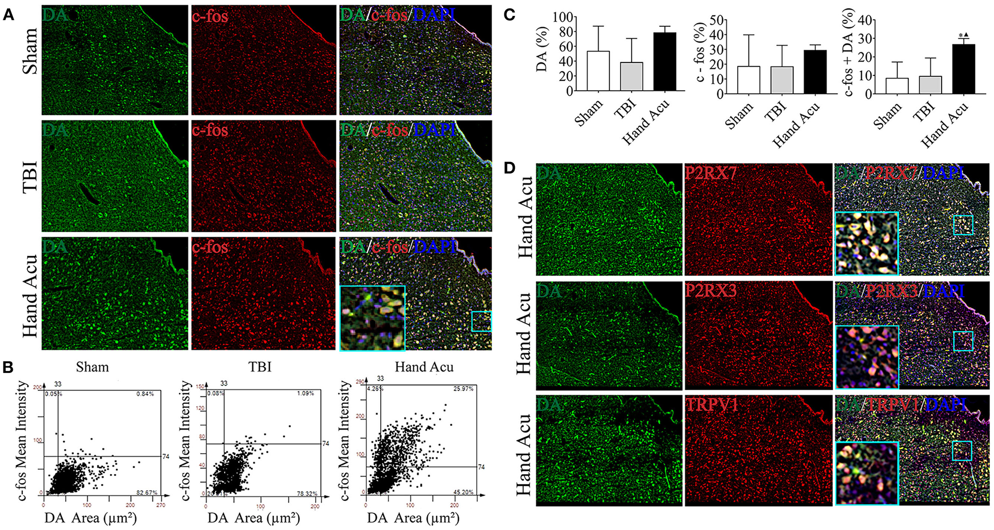HTWP acupuncture activates dopaminergic neurons in the ventral periaqueductal gray. (A) Confocal and co-localization analyses of DA with c-fos and DAPI. (B,C) HistoFAXS tissue analysis of c-fos staining mean intensity vs. area (μm2), and quantitative analysis by image scanning of co-localization of c-fos with DA in the left vPAG of sham and TBI rats treated with or without HTWP acupuncture (hand Acu). (D) Confocal analyses and co-localization of P2RX7, P2RX3, TRPV1, and DA and in the left vPAG of sham and TBI rats treated with or without HTWP acupuncture (hand Acu, n = 3–4/group; one-way ANOVA). Error bars represent mean + SEM; ▴P < 0.05 vs. TBI; *P < 0.05 vs. Sham.