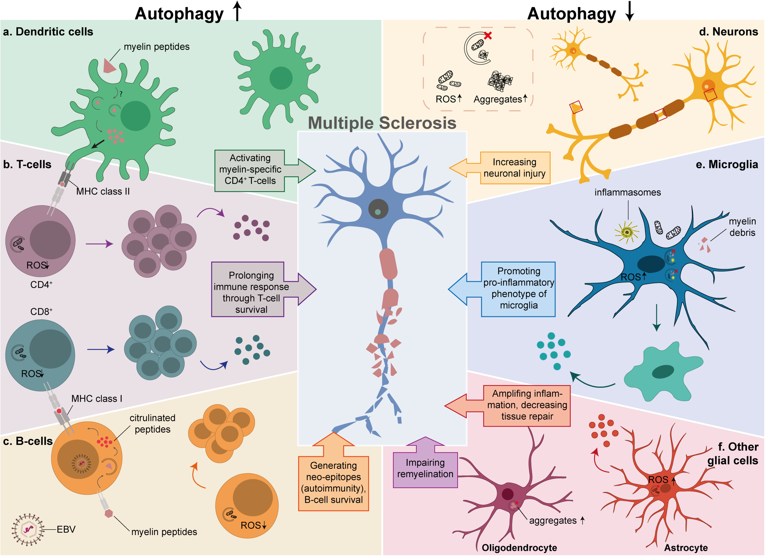 Although autophagy is important to maintain homeostasis in all cell types, its requirement for other functions and consequently its regulation varies in the different cell types and consequently its regulation differs as well (Liang and Le, 2015). This aspect also emerges in the context of MS, in which autophagy appears to contribute to the pathology in DCs, T-cells and B-cells, while it has a protective role in neurons and glial cells.