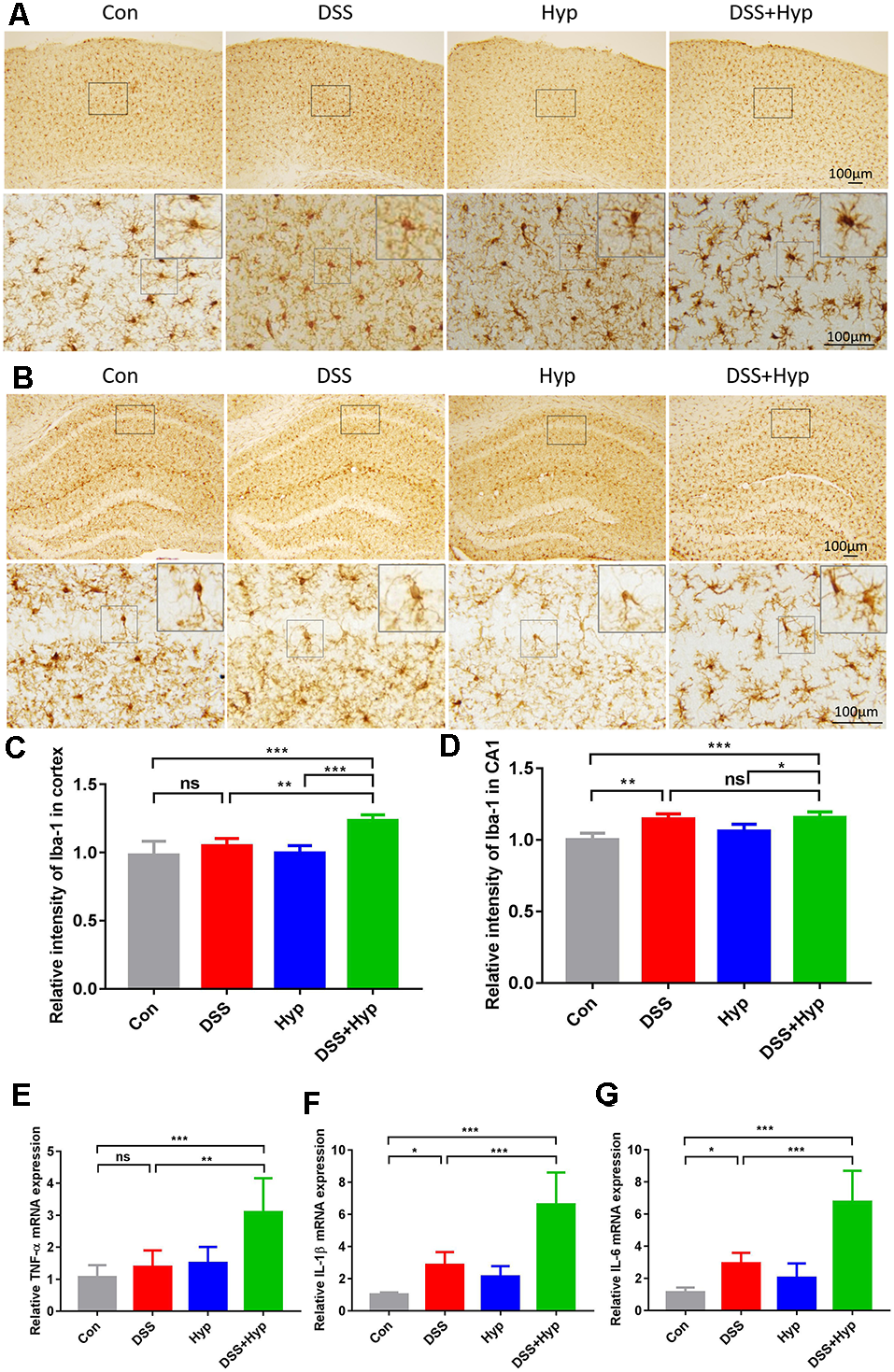 Figure 4. Hypoxia augmented the activation of microglia and increased the proinflammatory cytokines in the brains of mice with colitis. (A,C) Representative images and statistical analysis of microglial activation in the cortex on day 7 (**p < 0.01, ***p < 0.001, ns, not significant; n = 4/group). (B,D) Representative images and statistical analysis of microglial activation in the hippocampus on day 7 (*p < 0.05, **p < 0.01, ***p < 0.001, ns, not significant; n = 4/group). (E–G) Hypoxia + DSS and DSS increased TNF-α, IL-1β and IL-6 mRNA expression in the brain cortex (by real-time PCR). The expression of TNF-α, IL-1β and IL-6 was increased by hypoxia + DSS compared with DSS (*p < 0.05, **p < 0.01, ***p < 0.001, ns, not significant; n = 6/group).