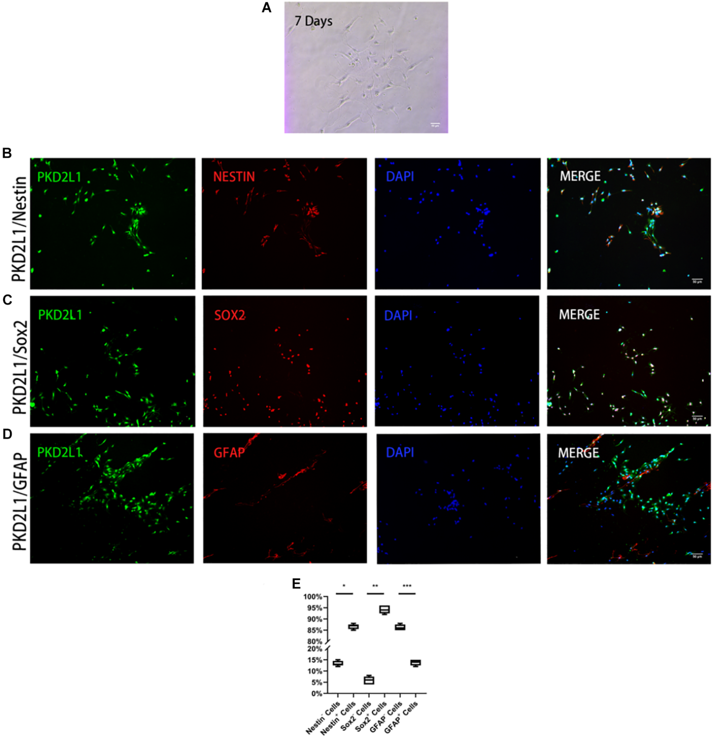 Axonal connections among various conglomerates of neurons was observed when CSF-cNs had been cultured for 7 days in an adherent system (Figure 2A). To determine whether these adherent cells exhibited specific stem cell properties, we used immunofluorescence to detect whether these cells expressed markers of NSCs. Analysis showed that approximately 86.60 ± 1.02% of PKD2L1+ CSF-cNs expressed Nestin (Figure 2B), 94.30 ± 1.60% expressed SOX2 (Figure 2C), and 13.80 ± 1.17% expressed GFAP (Figures 2D,E).