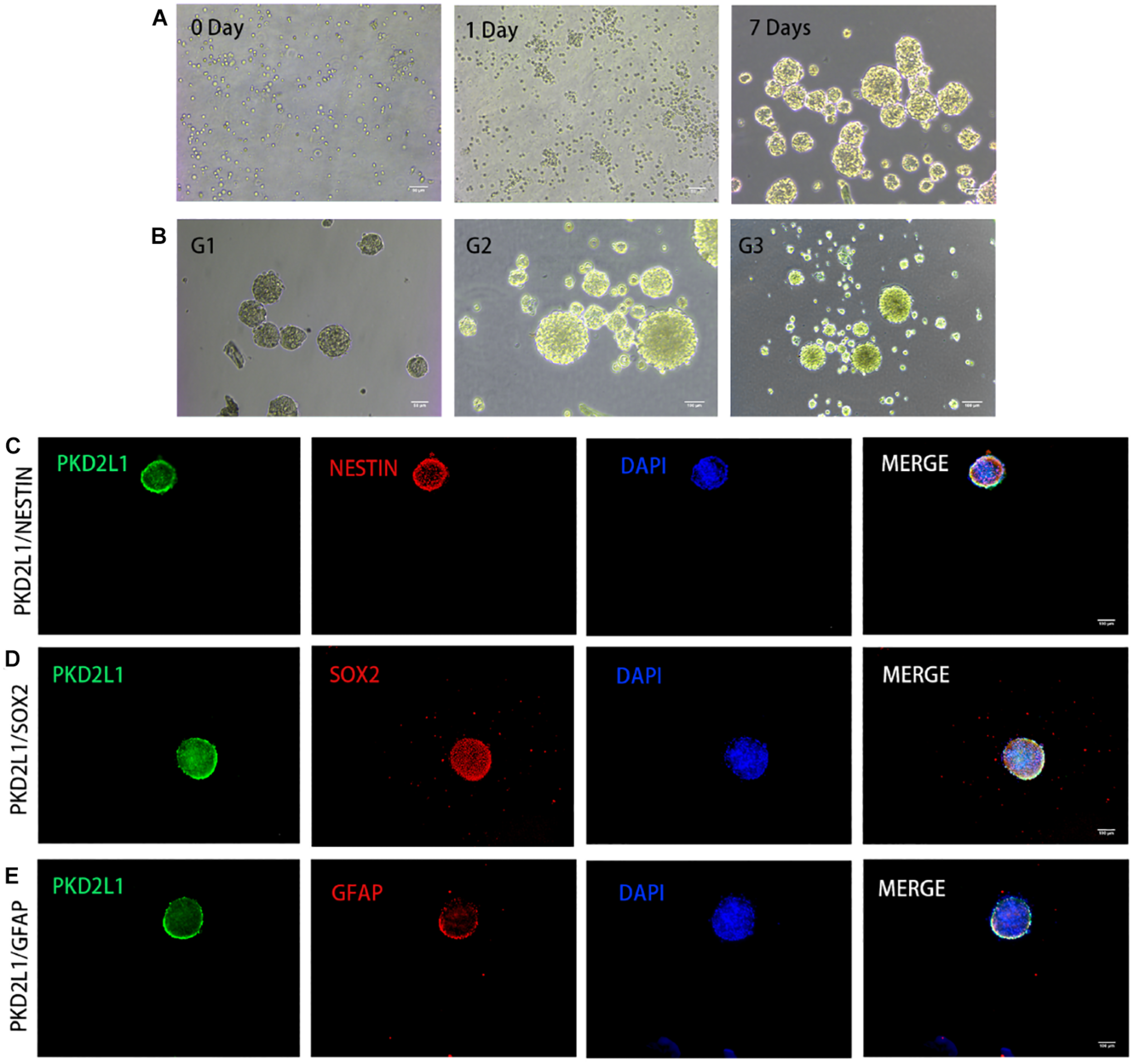 Immunofluorescence analysis of the neurospheres from the third passage expressed a panel of typical markers for NSCs, including Nestin (Figure 3C), Sox2 (Figure 3D), and GFAP (Figure 3E). Notably, the neurospheres also expressed PKD2L1, demonstrating the neurospheres formed by CSF-cNs.
