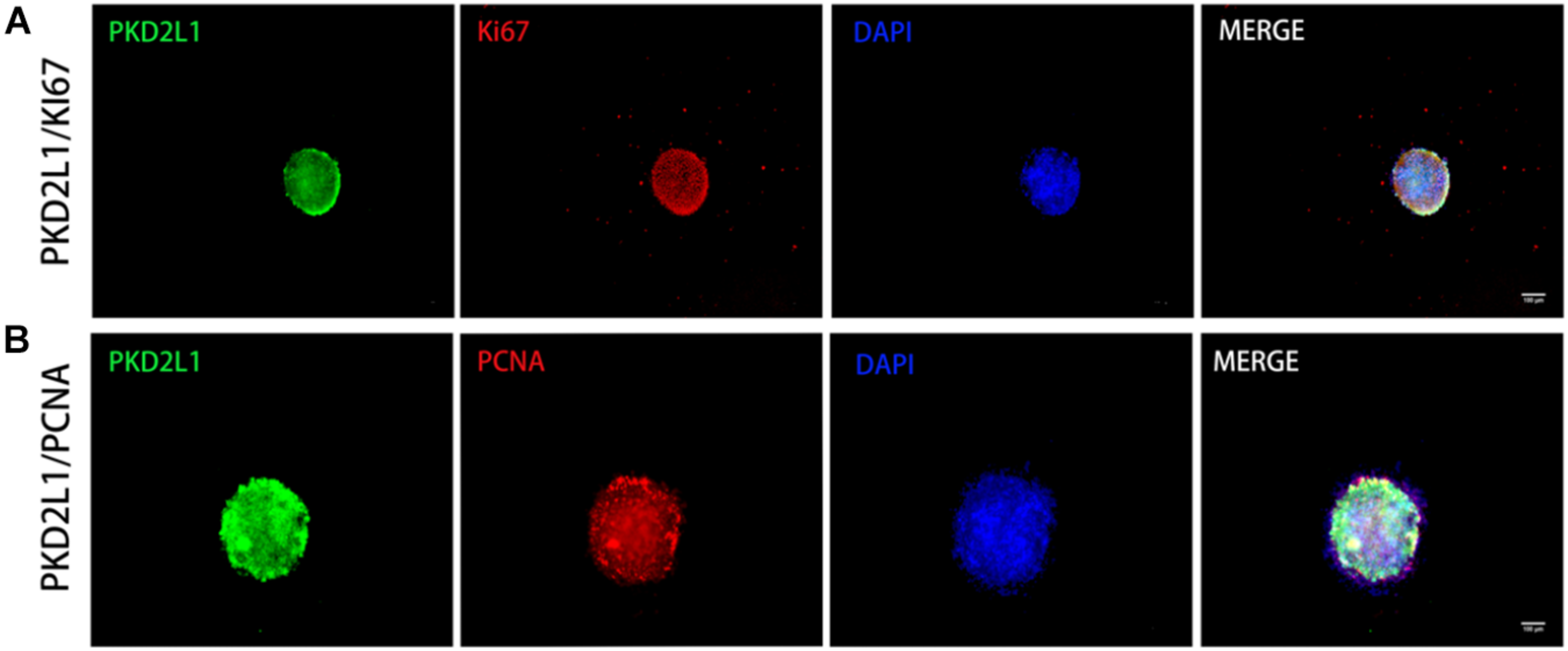 Neurospheres formed by CSF-cNs exhibited the ability to proliferate. (A,B) Immunofluorescence analysis showing that neurospheres were able to proliferate and expressed both Ki67 (A) and PCNA (B).
