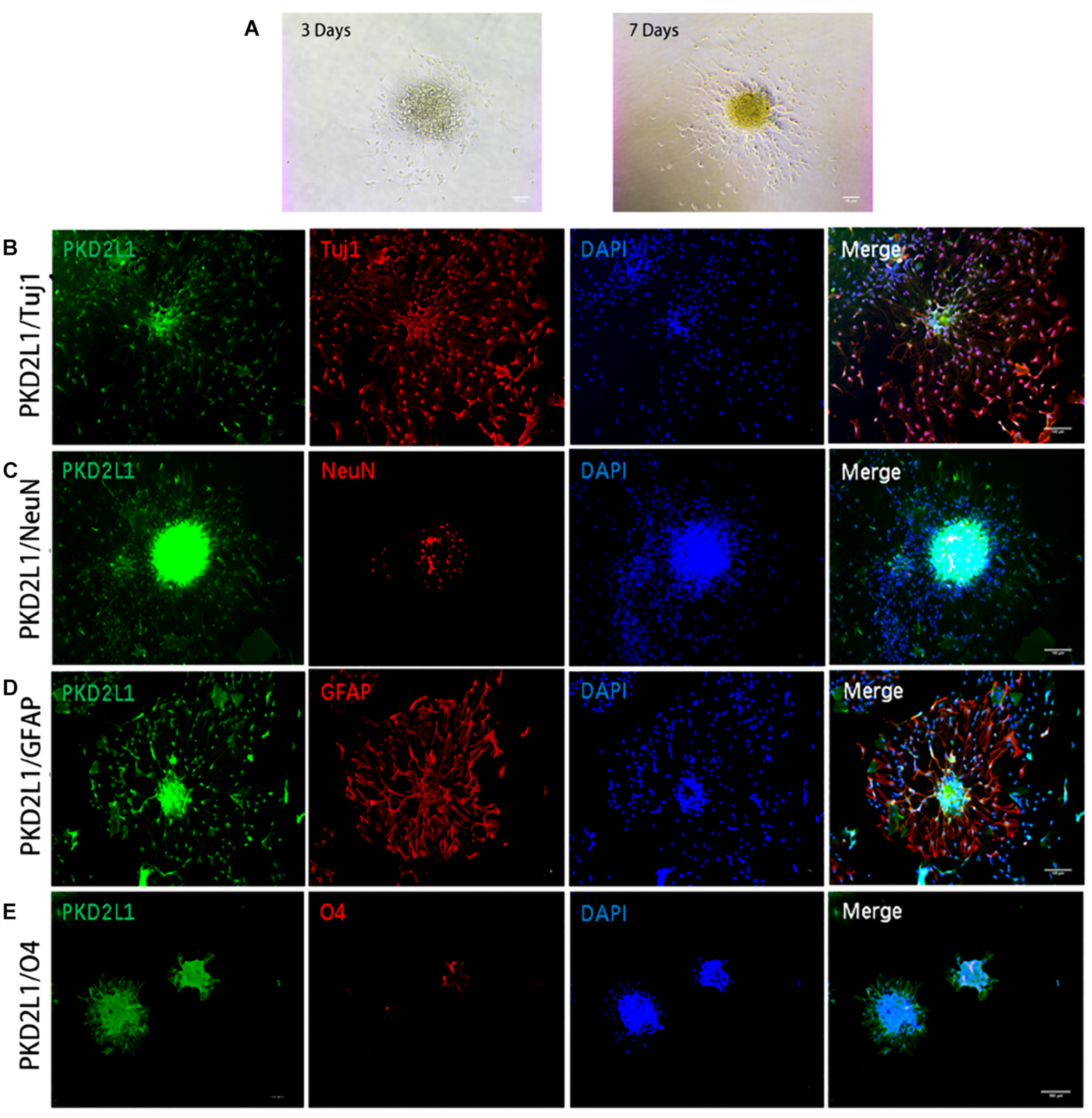 To characterize the ability of the neurospheres formed by CSF-cNs to differentiate, we re-inoculated neurospheres into a Petri dish coated in poly-D-lysine in a culture media containing bFGF and EGF to encourage differentiation (Figure 5A). After 7 days’ differentiation culture, the cells from the PKD2L1 + CSF-cNs-forming neurospheres expressed Tuj1 and NeuN by immunofluorescence staining, indicating PKD2L1+ CSF-cNs has the ability of differentiation into neurons (Figures 5B,C). Next, the expression of GFAP was detected around the neurospheres after 7 days’ differentiation culture by immunofluorescence staining, suggesting that PKD2L1+ CSF-cNs is able to differentiate into astrocytes (Figure 5D). In addition, the cells around the neurospheres expressed low of O4 after 7 days’ differentiation culture, implying that PKD2L1+ CSF-cNs can differentiate into Oligodentrocytes (Figure 5E). In conclusion, these results demonstrated that the neurospheres formed by PKD2L1+ CSF-cNs obtained the potential of differentiation into neoron, astrocyte, and Oligodentrocytes.