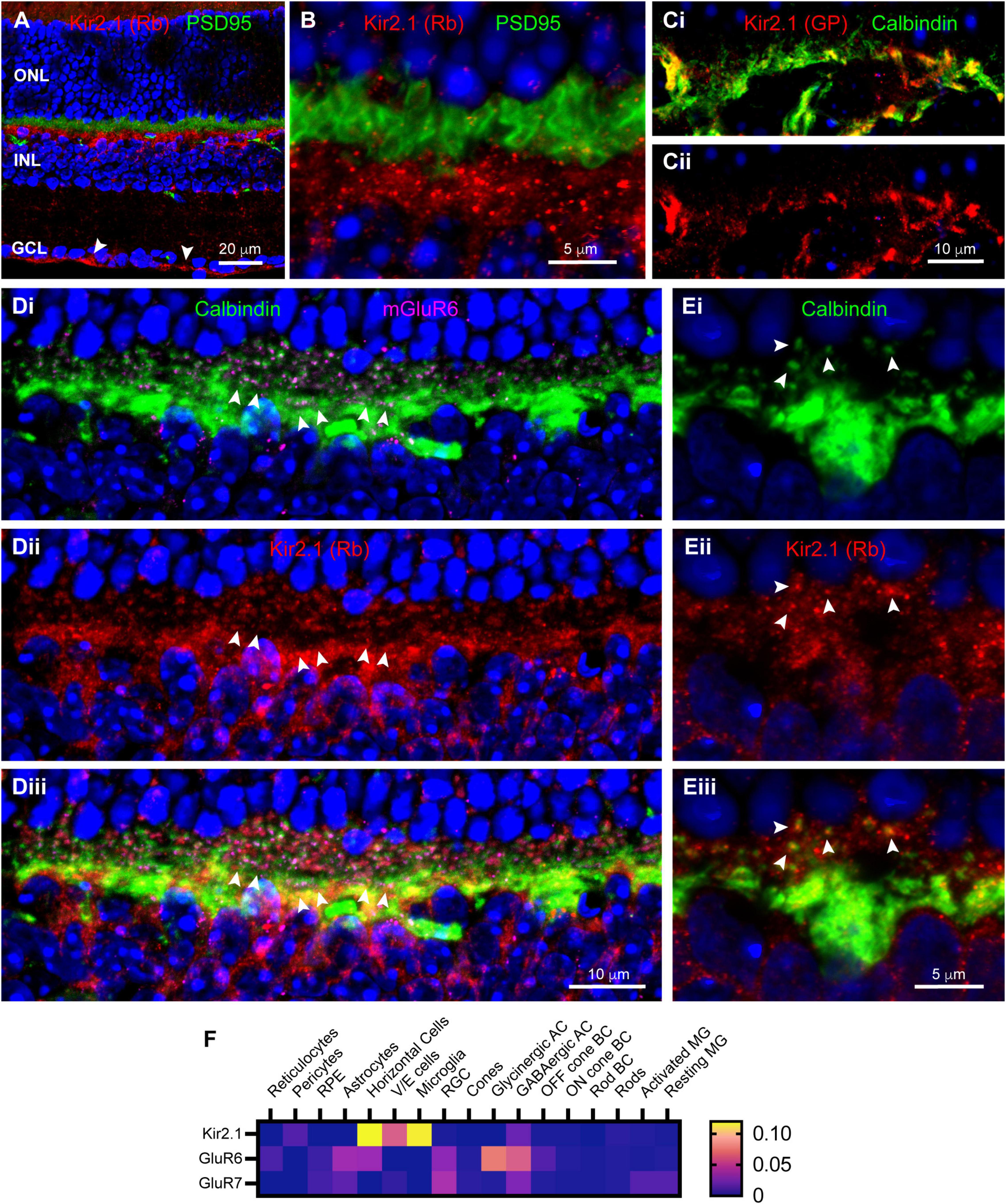 Figure 4. Localization of inward rectifier potassium channel Kir2.1 in mouse retina. (A) Immunostaining for Kir2.1 (rabbit antibody; red) with DAPI counterstaining (blue) and PSD95 (green) to label photoreceptor terminals. Labels for retinal nuclear layers are as in Figure 1. Kir2.1 is diffusely present in the IPL, but strongly labeled at the inner limiting membrane (arrowheads) and in the OPL. Five μm confocal stack. (B) Higher magnification view of the OPL reveals Kir2.1 (red) labeling largely below the photoreceptor terminals (green; PSD95 labeling), but with some diffuse and punctate labeling among the terminals. Two μm confocal stack. (Ci) Kir2.1 labeling (guinea pig antibody; red) colocalizes with Calbindin labeled horizontal cells (green) in the OPL. (Cii) Kir2.1 labeling in isolation. (Di) Another view of horizontal cells in the OPL (Calbindin labeling; green) along with mGluR6 labeling (magenta) to show locations of On bipolar cell dendritic tips. Clusters of mGluR6 label indicate cone terminals; three examples are indicated with paired arrowheads. Six μm confocal stack. (Dii) Kir2.1 labeling (rabbit antibody; red) in the same section. (Diii) Merged view of all three labels. Kir2.1 shows both diffuse and punctate labeling in the vicinity of horizontal cell axon terminal projections contacting rods, but little labeling near clusters of dendritic processes contacting cones. (Ei) Higher magnification view of a horizontal cell labeled with Calbindin antibody (green). Several representative axon terminal tips are highlighted with arrowheads. One μm confocal stack. (Eii) Kir2.1 labeling in the same section. (Eiii) Merged view of the two labels shows that tips of horizontal cell axon terminal processes contain punctate clusters of Kir2.1 labeling (arrowheads). (F) Average mRNA expression levels of Kir2.1 (Kcnj2) and kainate receptor subunits GluR6 (Grik2) and GluR7 (Grik3) in mouse retina from single-cell transcriptome data. Kir2.1 is most prominently expressed in horizontal cells and essentially absent from Müller glia. The kainate receptor subunit GluR6 is also found in horizontal cells and Off bipolar cells, but GluR7 is absent from these cell types. Data adapted from Hoang et al. (2020).