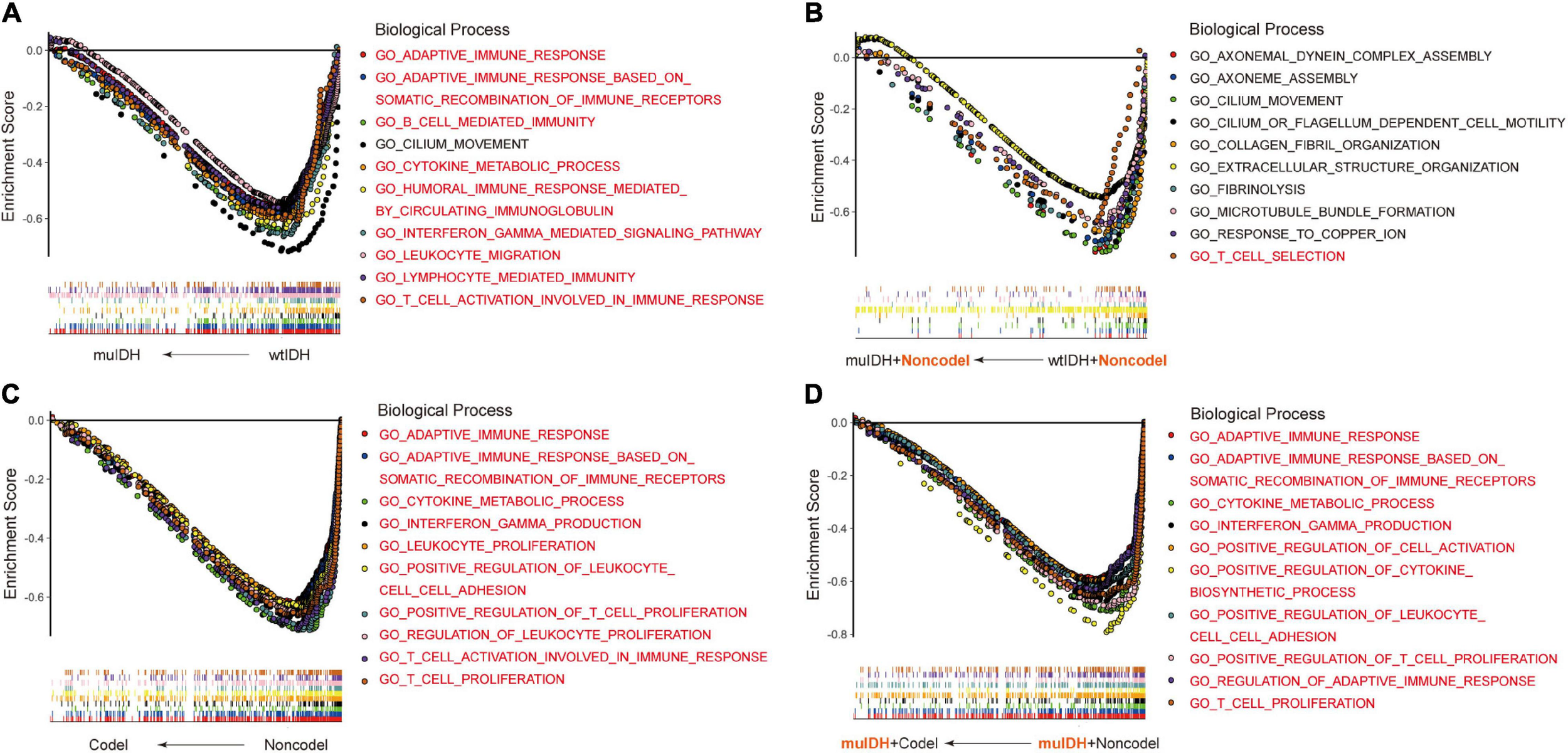 Gene Set Enrichment Analysis (GSEA) using the human biological processes (BPs) gene set. (A) The top ten BPs negatively associated with IDH mutation status in LGGs. (B) The top ten BPs negatively associated with IDH mutation status in LGGs with 1p/19q non-codel. (C) The top ten BPs negatively associated with 1p/19q codel status in LGGs. (D) The top ten BPs negatively associated with 1p/19q codel status in LGGs with IDH mutation. The immune-related BPs were marked in red.