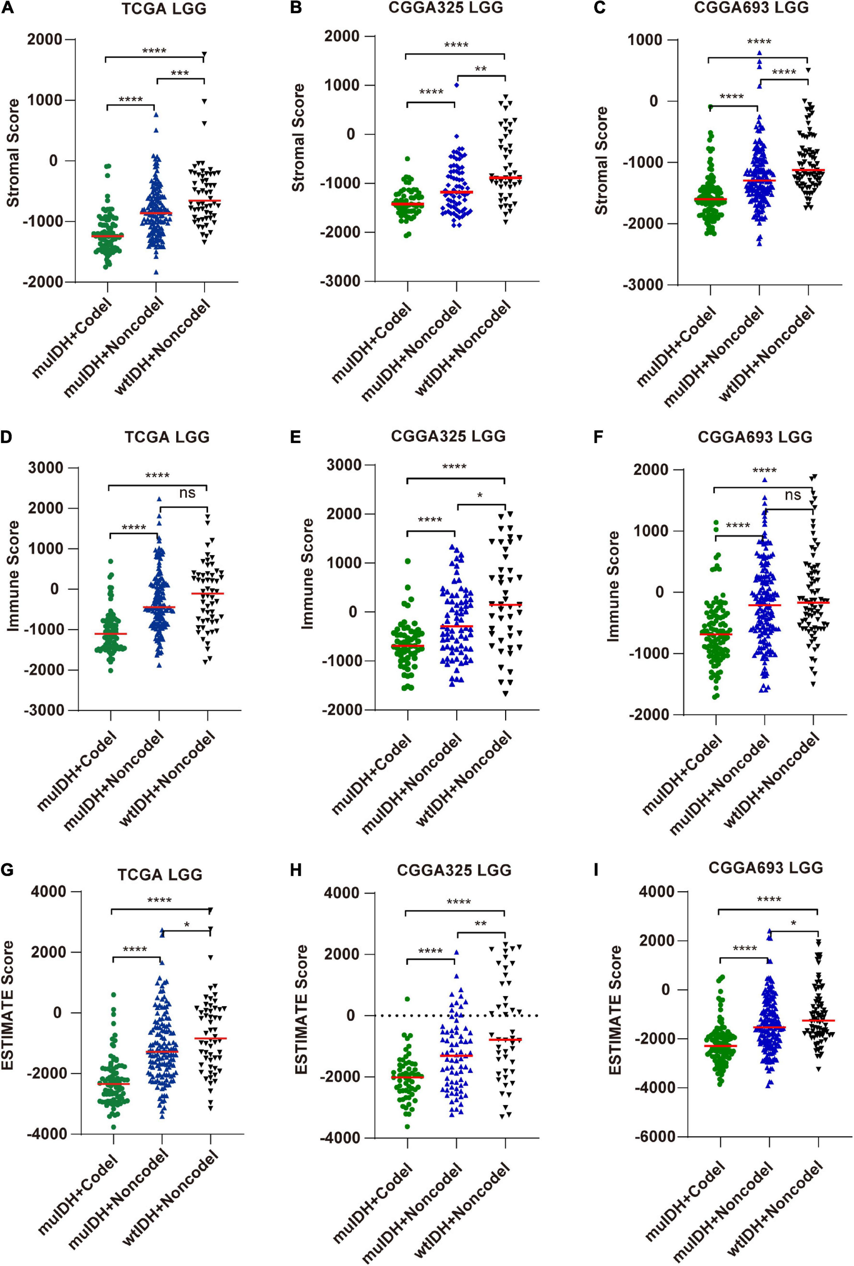 Estimating the infiltrating level of stromal cells, immune cell, and tumor purity in LGG using ESTIMATE algorithm. (A–C) Stromal score (positively correlated with the level of stromal cell in tumor) of samples in different subgroups in TCGA LGG (A), CGGA325 LGG (B), and CGGA693 LGG (C). (D–F) Immune score (positively correlated with immune cell infiltration in tumor) of samples in different subgroups in TCGA LGG (D), CGGA325 LGG (E), and CGGA693 LGG (F). (G–I) ESTIMATE score (negatively correlated with tumor purity) of samples in different subgroups of LGGs in TCGA LGG (G), CGGA325 LGG (H), and CGGA693 LGG (I). Each symbol represents an individual patient. The number of patients in each subgroup was shown in Figure 1. The mean scores are indicated by red lines. P values are inferred from a two-sided Student’s t-test or Mann-Whitney test. *p < 0.05, **p < 0.01, ***p < 0.001, ****p < 0.0001.