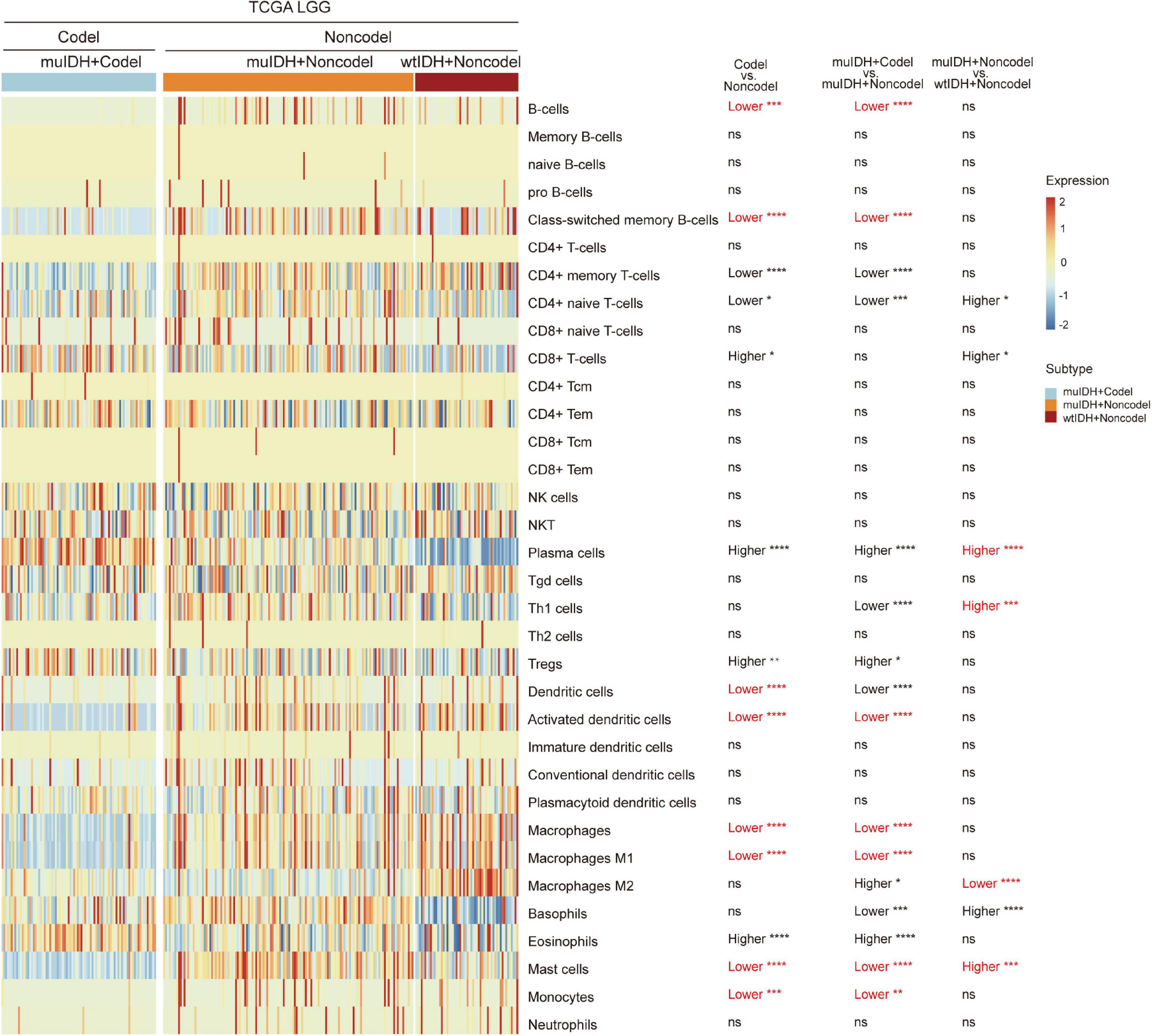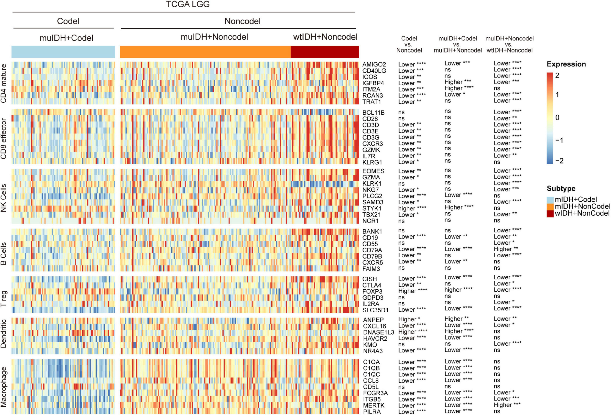 Expression of marker genes for immune cells in TCGA LGG. The heatmap shows the expression levels of marker genes for CD4+ T cells, effector CD8+ T cells, NK cells, B cells, T-reg cells, dendritic cells, and macrophages among different subgroup LGGs in TCGA LGG. P values are inferred from a two-sided Student’s t-test or Mann-Whitney test. The number of patients in each subgroup was shown in Figure 1. *p < 0.05, **p < 0.01, ***p < 0.001, ****p < 0.0001.