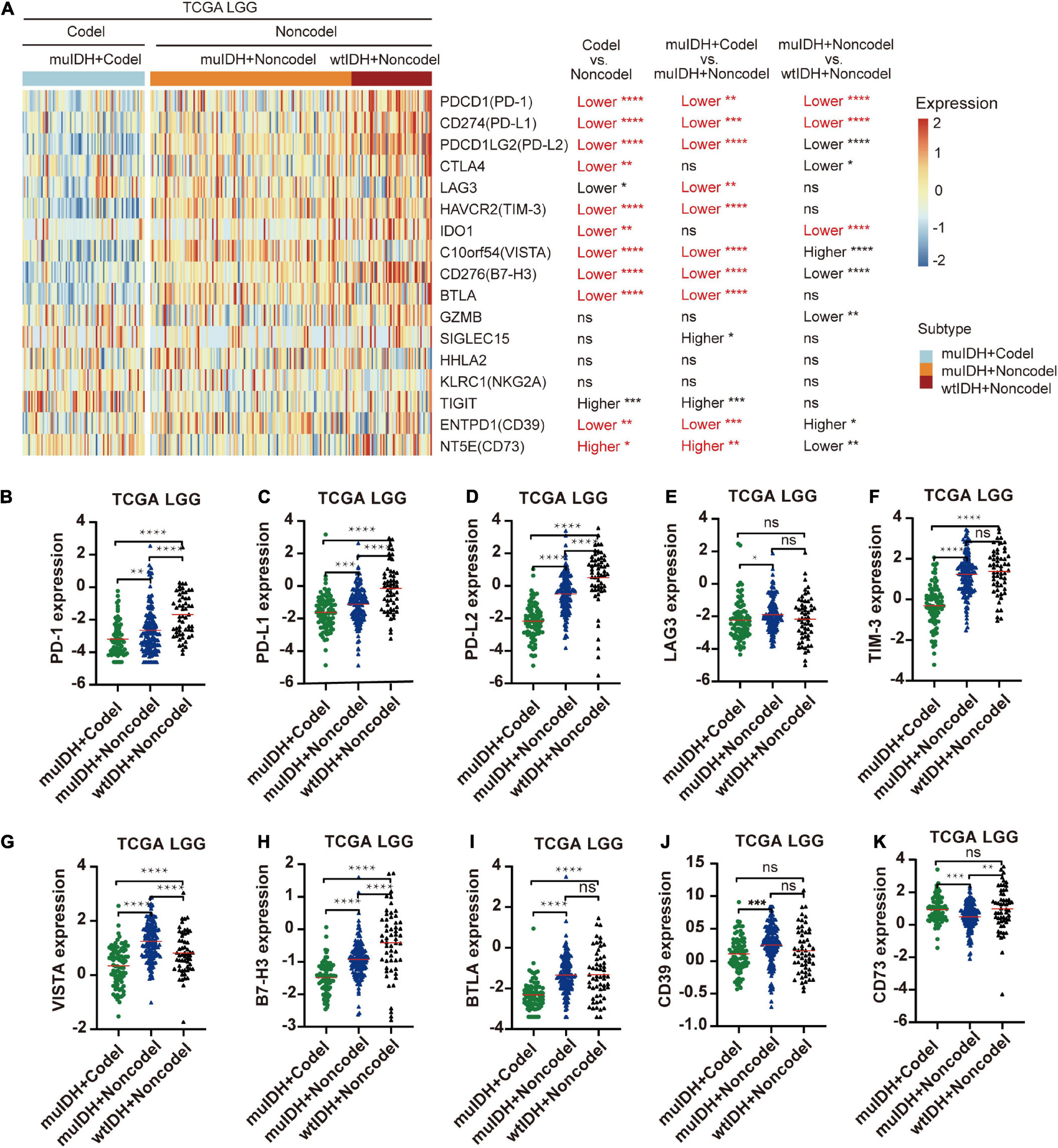 Differentially expressed immune checkpoint genes among different subgroups. (A) The heatmap shows the expression levels of immune-related genes on chromosome 1p/19q among different subgroup LGG patients in TCGA LGG. The significant differences confirmed in both CGGA325 and CGGA693 LGG were marked in red. (B–K) The relative mRNA expression of PD-1 (B), PD-L1 (C), PD-L2 (D), LAG3 (E), TIM-3 (F), VISTA (G), B7-H3 (H), BTLA (I), CD39 (J), and CD73 (K) in TCGA LGG. The mean mRNA expression was indicated by red lines. P values are inferred from a two-sided Student’s t-test or Mann-Whitney test. The number of patients in each subgroup was shown in Figure 1. *p < 0.05, **p < 0.01, ***p < 0.001, ****p < 0.0001.