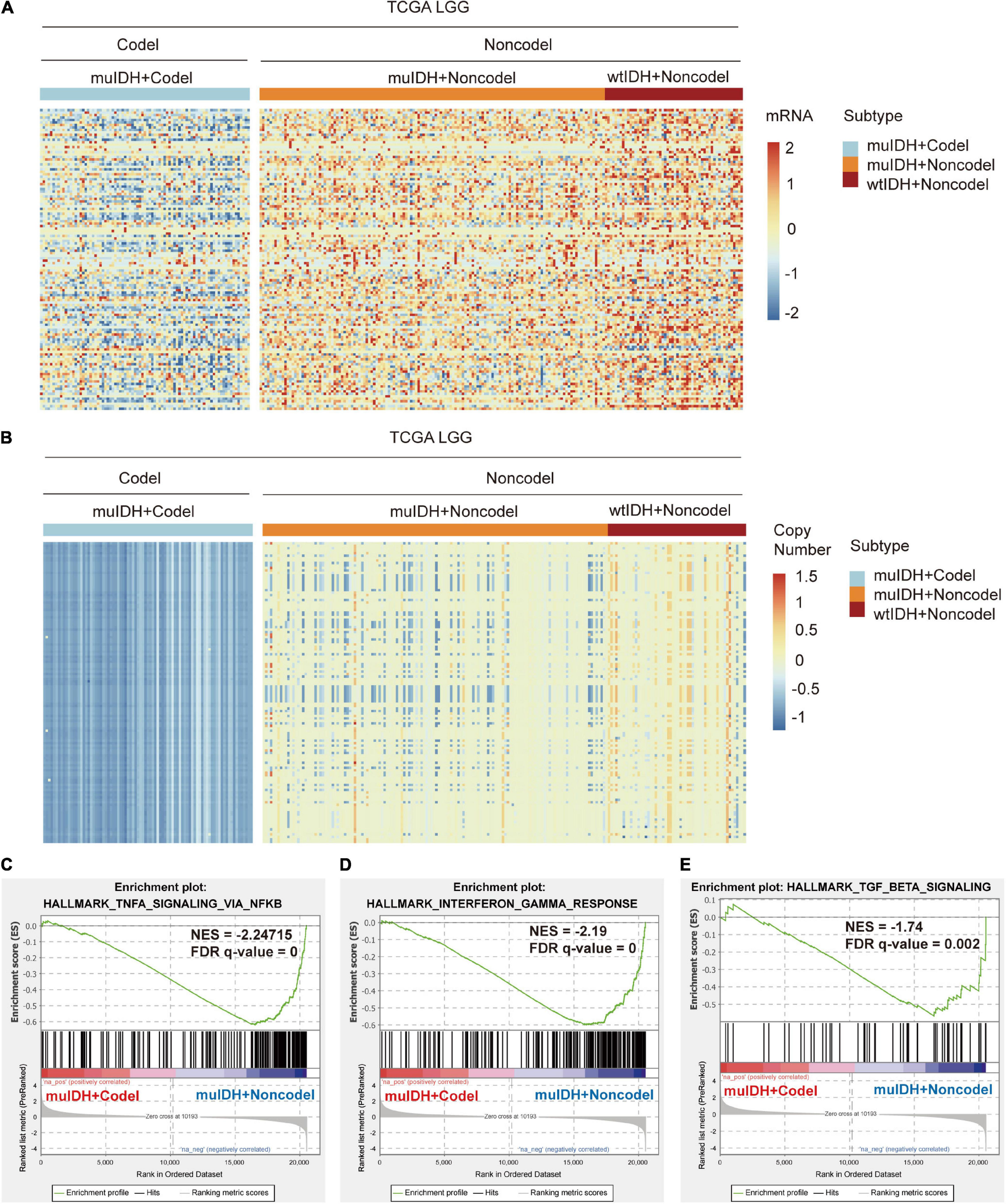 Expression and copy number variation of immune-related genes on chromosome 1p/19q. (A) Heatmap of differentially expressed immune-related genes in LGG patients among different subgroups in TCGA LGG. (B) Heatmap of copy number variation of immune-related genes in LGG patients among different subgroups in TCGA LGG. (C–E) Gene set enrichment analysis indicates a significantly reduced “TNFA SIGNALING VIA NFKB” (C), “INTERFERON GAMMA RESPONSE” (D), and “TGF BETA SIGNALING” (E) in the cases of LGGs with 1p/19q codel.