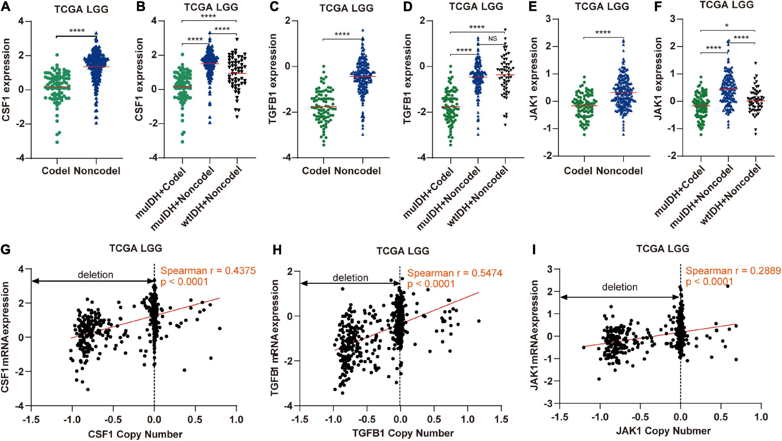 The expression and copy number of CSF1, TGFB1, and JAK1 among different subgroups classified by IDH mutation and 1p/19q codel status in TCGA LGG. (A,C,E) The expression of CSF1, TGFB1, and JAK1 in 1p/19q codel and 1p/19q non-codel LGGs in TCGA LGG dataset. (B,D,F) The expression of CSF1, TGFB1, and JAK1 in different subgroups. The mean mRNA expression was indicated by red lines. P values are inferred from a two-sided Student’s t-test or Mann-Whitney test. (*p < 0.05, ****p < 0.0001). (G–I) Correlation analysis between copy number alteration and mRNA expression of CSF1, TGFB1, and JAK1 in TCGA LGG, respectively.