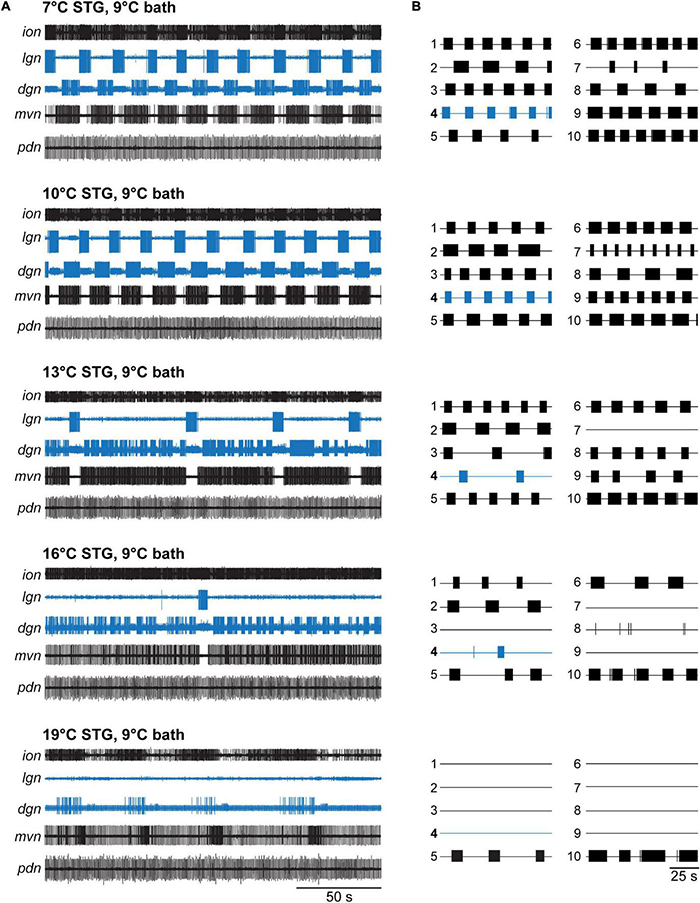VCN gastric mill rhythms crash when only the STG is heated. (A) Example extracellular nerve recordings of both the gastric mill (lgn, dgn) and pyloric (pdn) rhythms at different STG temperatures. Recordings of the gastric mill neurons LG (on the lgn) and DG (on dgn) are highlighted in blue. The pdn recording shows the activity of the PD neurons as a representation of the pyloric rhythm. For completeness, the activity of the inferior cardiac (IC) and ventricular dilator (VD) neurons (both gastro-pyloric neurons) on the mvn is plotted as well. Note, the gastric mill (GM) neurons, which participate in the VCN rhythm, are absent from the mvn because the recording was taken peripherally, after all GM axons had left this nerve. For each temperature, a gastric mill rhythm was elicited with dpon stimulation. Bath temperature was kept constant at 9°C while STG temperature was increased. At elevated STG temperatures (16 and 19°C), dpon stimulation failed to elicit a gastric mill rhythm. (B) Summary of all experiments (N = 10 preparations). Each numbered trace represents the spike activity of LG over 100 s for one experiment, recorded 300 s after the end of the dpon stimulation. The blue trace corresponds to the example shown in (A).