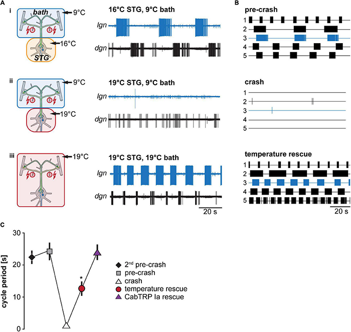 We tested whether temperature-induced up-regulation in projection neuron firing frequency is sufficient to prevent the termination of the VCN gastric mill rhythm at elevated temperatures (Figure 4). Like in our previous experiments, we stimulated the dpon to elicit a VCN gastric mill rhythm while we heated the STG to different temperatures. We then determined the crash temperature, i.e., the temperature at which stimulation failed to elicit a gastric mill rhythm. The ganglia extrinsic to the STG were then also heated to the crash temperature. The dpon was stimulated again with both, the STG and the CoGs, at crash temperature. Figure 4A shows a representative recording of LG at 16°C (trace i), where the rhythm could still be elicited, and then at a crash temperature of 19°C (ii), where the rhythm failed when only the STG was heated. After additionally heating the CoGs to 19°C (iii), however, the gastric mill rhythm could be recovered with dpon stimulation. In all preparations tested (N = 5, Figure 4B), heating of the STG and CoGs together led to a rescue of gastric mill activity at crash temperature. We further noted that the rhythm sped up during this rescue, with a significantly shorter cycle period than at the last temperature before the crash (pre-crash, Figure 4C). This result is consistent with the observation of Powell et al. (2021) that increasing temperatures caused faster rhythms when STG and CoGs were heated together. Our data also suggest that a heat-activated factor extrinsic to the STG is sufficient to enable temperature robustness of the gastric mill rhythm.