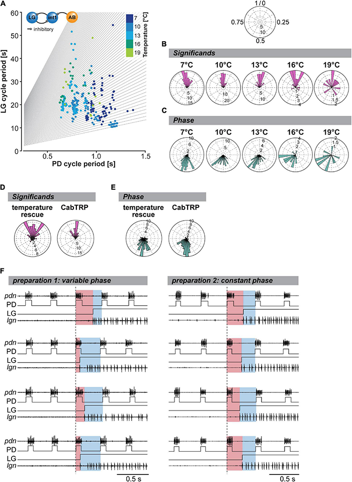 Integer coupling is always present when gastric mill and pyloric rhythms are active but weakens at elevated temperature. (A) LG cycle period as a function of mean PD period (= mean of all PD bursts within one LG cycle period). Gray lines represent the integer slopes and data points with integer coupling lie along these lines. N = 10 preparations. Inset: The synaptic connectivity between the pyloric pacemaker AB and the gastric mill CPG neurons (Interneuron 1 and LG) underlies integer coupling between pyloric and gastric mill rhythms. (B) Significant for all tested preparations (N = 10) shown as rose plots for various STG temperatures. Integer coupled data points will coincide at the top of the diagram (close to 1/0, see schematic at the top). Vector strengths are indicated by the radius of the plot. Analyzed were 200 s of recordings, 300 s after the last dpon stim. Rayleigh z Test: 7°C: Rayleigh z65.6, p < 0.001, 10°C: Rayleigh z83.8, p < 0.001, 13°C: Rayleigh z49.7, p < 0.001, 16°C: Rayleigh z12.6, p < 0.001, 19°C: Rayleigh z3.0, p = 0.045. (C) Analysis of phase coupling of the LG and PD burst onset at various temperatures (N = 10 preparations). Rayleigh z Test: 7°C: Rayleigh z64.2, p < 0.001, 10°C: Rayleigh z77.3, p < 0.001, 13°C: Rayleigh z46.3, p < 0.001, 16°C: Rayleigh z12.8, p < 0.001, 19°C: Rayleigh z3.5, p = 0.027. (D) Significant of all gastric mill cycles and animals for the temperature rescue (N = 10) and CabTRP Ia (1 μM, N = 9) experiments. Rayleigh z Test: temperature rescue: Rayleigh z24.3, p < 0.001; CabTRP Ia rescue: Raleigh z47.2, p < 0.001. (E) Phase coupling of the LG and PD burst onsets for the temperature rescue and CabTRP Ia (1 μM) experiments. Rayleigh z Test: temperature rescue: Rayleigh z38.5, p < 0.001; CabTRP Ia rescue: Rayleigh z48.9, p < 0.001. (F) Example recordings from two preparations during temperature rescue. The LG burst is shown with a recording of the lgn and schematized LG bursts (LG). Four individual LG burst onsets are displayed (top to bottom) for each preparation. Pyloric cycles are shown by recordings of the PD neurons (pdn) and schematized PD bursts (PD). The dashed vertical line indicates the beginning of the last PD burst before the LG burst onset. The time delay between PD onset and LG onset is highlighted in red. The remainder of the pyloric cycle is marked in blue. A change in the ratio of red and blue illustrates a shift in the phase relationship between PD and LG onset. The phase relationship varied for the preparation shown on the left but not for the one on the right.