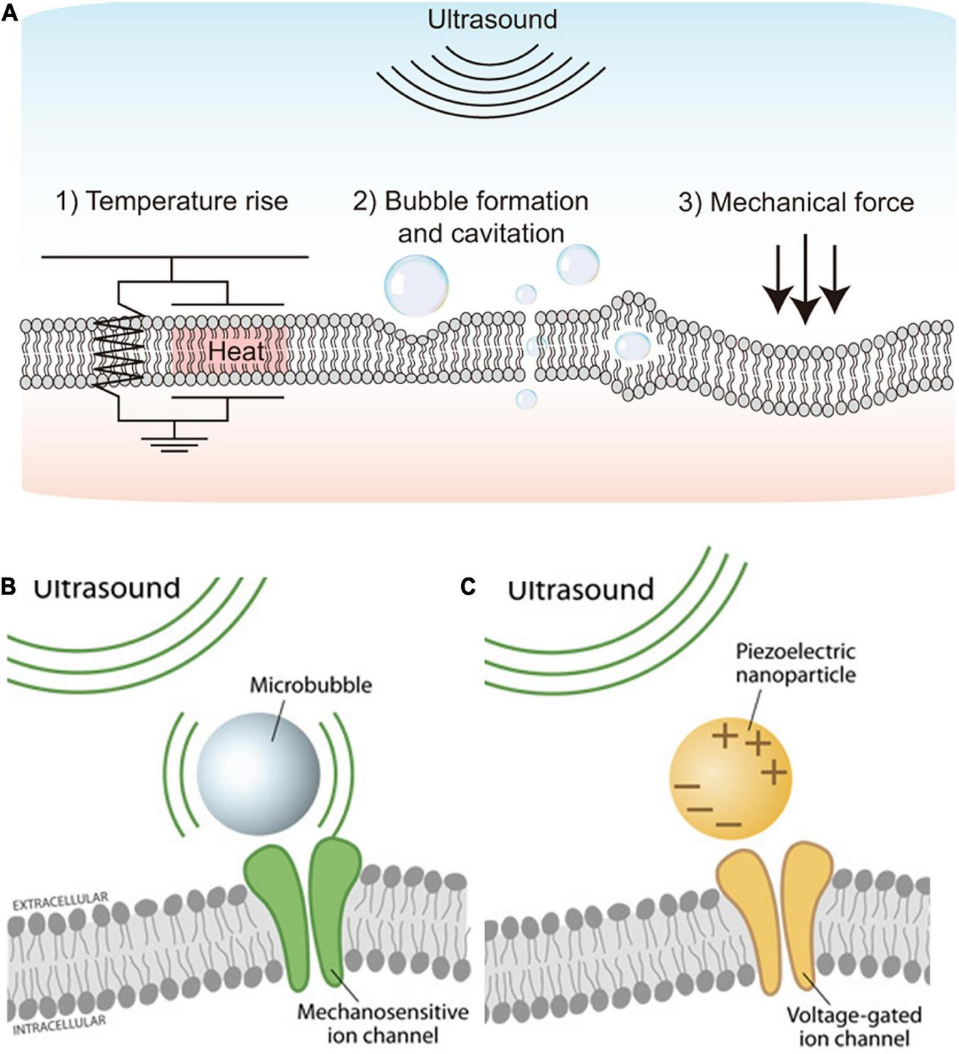 Second, cavitation is a non-thermal effect caused by ultrasound (Figure 1A2), which directly modulates ion channels as well as the plasma membrane for neuromodulation (Fomenko et al., 2018). Cavitation makes gas bubbles forming, oscillating, and possibly collapsing within the tissue, resulting in stimulation of action potentials and synaptic transmission by deforming the bilayer lipid membrane (Krasovitski et al., 2011). The cavitation can happen by ultrasound waves at low frequency (1–3 MHz); however, acoustic pulses at higher frequencies (>4 MHz) are difficult to be used because oscillations in bubbles are difficult to be maintained during cavitation (Menz et al., 2019).