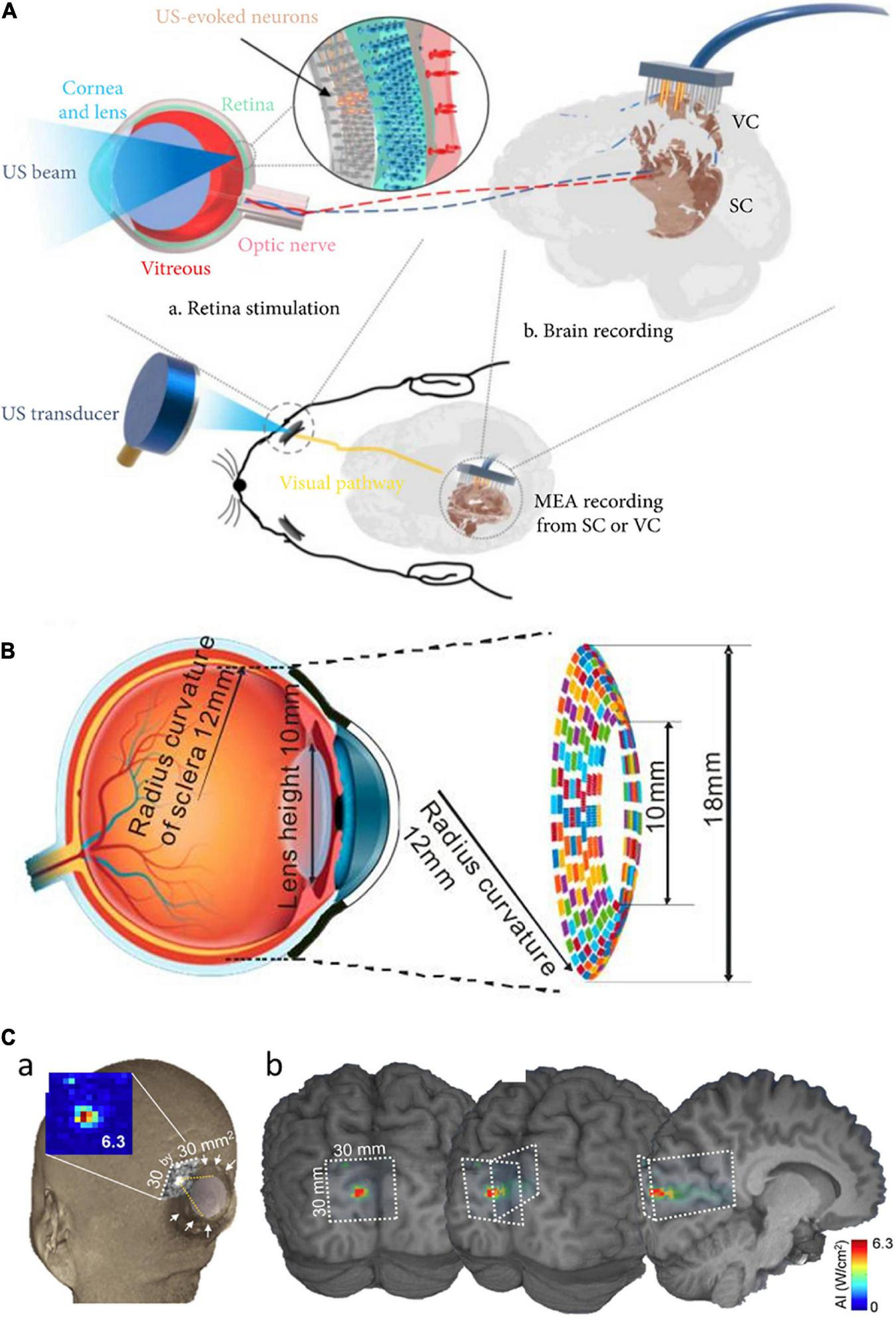 Focused ultrasound treatment for visual restoration. (A) Retinal neurons were excited by ultrasound waves which lead to the generation of the neural signal. These signals are transmitted to the brain via the optic nerve and the brain activity is recorded from the visual cortex or the superior colliculus. Adapted from Qian et al. (2022). (B) The circular racing array device for ultrasonic stimulation. Adapted from Yu et al. (2019). (C) In simulated acoustic intensity profiles, the acoustic focus was effectively projected to the targeted stimulatory site localized in the calcarine fissure (a), and acoustic energy was delivered to the visual cortex (b). Adapted from Lee et al. (2016).