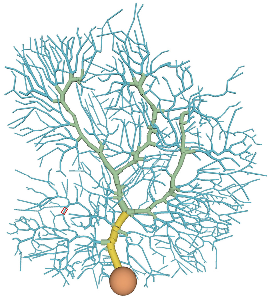 Distribution of compartment types in the PC model: soma (orange), main dendrite (yellow), spiny dendrite (blue), and smooth dendrite (green). Each type has different ion channels. A typical stimulated site was shown in a red box (see also Figure 4A).