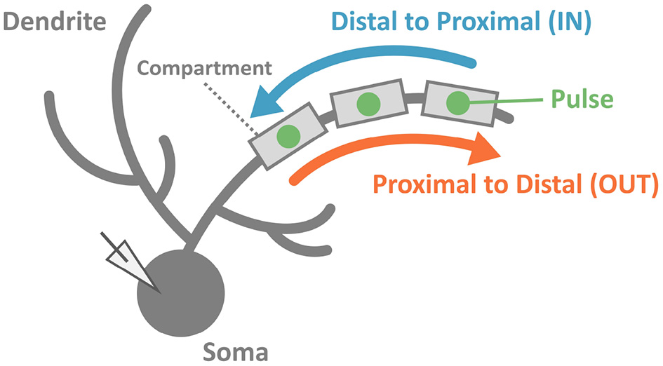 To reveal the capability of discrimination for temporal input sequences (or just “sequences" for short) in PCs, we stimulated dendrites in various ways. We injected multiple short current pulses at various dendritic compartments at various timings. In a typical setting, we chose 5 compartments aligned in straight, and fed short pulses to them sequentially either from distal to proximal dendrites (IN direction) or from proximal to distal dendrites (OUT direction). Then, we examined whether the soma emit spikes (Figure 2).