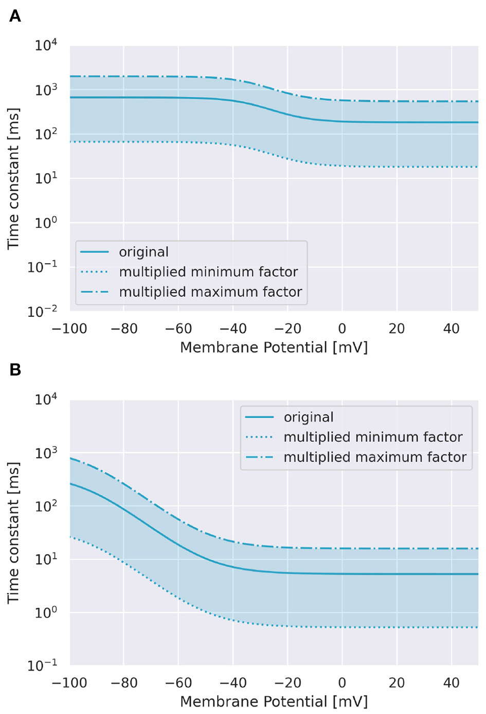 Range of inactivation time constants changed in the simulation. (A) CaP channel. (B) CaT channel.