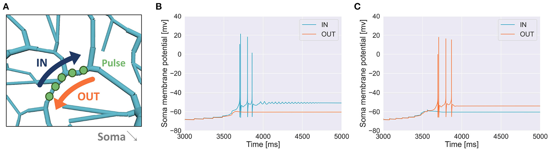 (A) Schema of stimulation. A segment of spiny dendrites was stimulated sequentially in either IN direction (blue) or OUT direction (orange), where the number of compartments was 5, time interval for each stimulation was 120 ms and synaptic weight (or pulse amplitude) was 7.920 nA. The stimulated site was shown in Figure 1. (B) Membrane potential in the soma recorded during the stimulation in IN direction (blue) and that in OUT direction (orange) as in (A), where the number of pulses was 6. (C) Another example when a different segment was stimulated, where the number of compartments was 8, interval was 80 ms and synaptic weight was 6.930 nA.