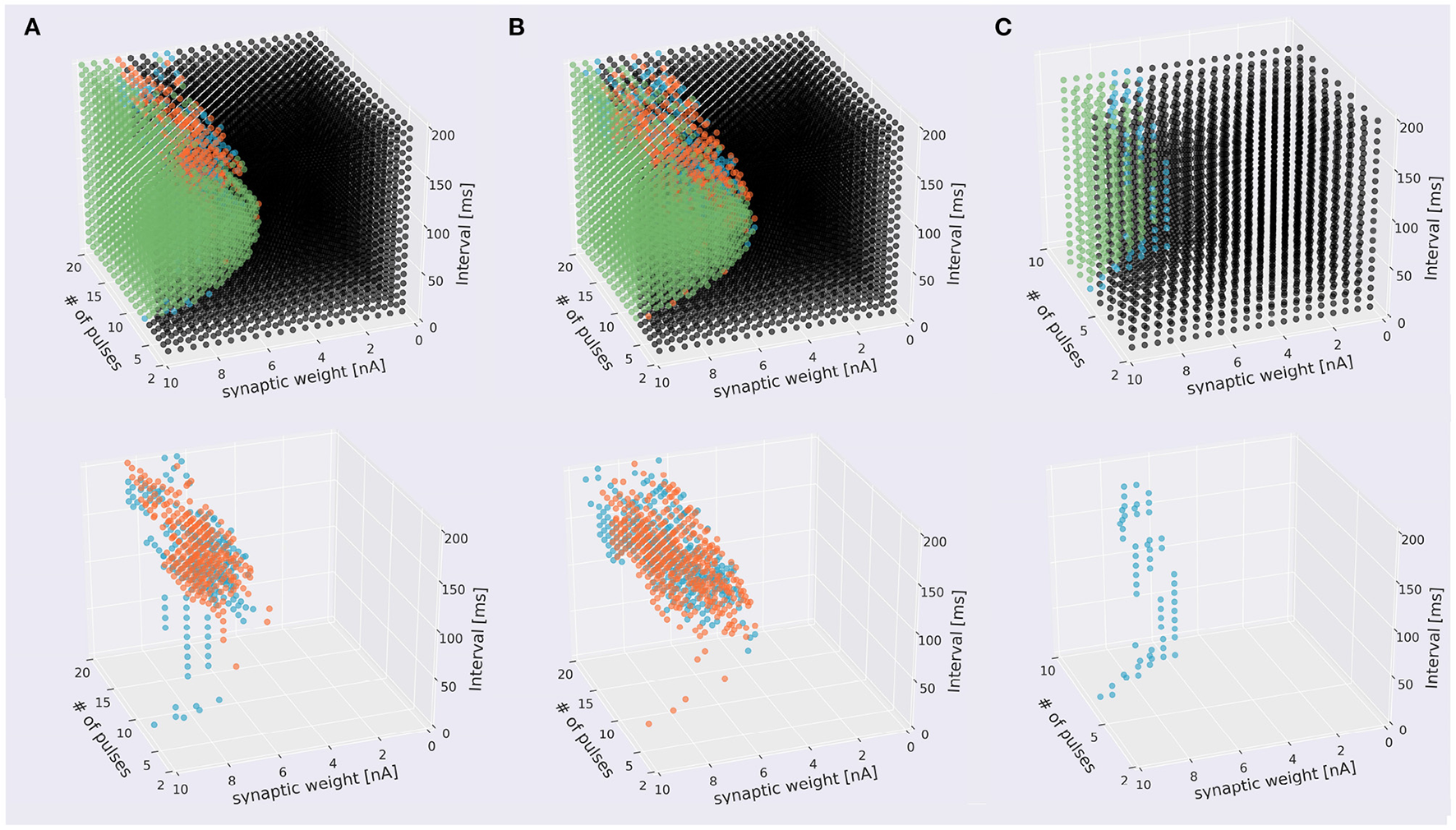 Scatter plots of stimuli that evoked different responses. The top panels four types of stimuli that evoked somatic response when stimulated in IN direction (blue), OUT direction (orange), both directions (green), and that did not evoke responses (black). The bottom figures omitted the plots of non-discriminated sequences. (A) Sequences starting from spiny dendrite. A 2,328 sequences induced spikes in both stimulus directions, 199 sequences were IN-only, 322 sequences were OUT-only, and 4,751 did not induce spikes in both directions. (B) Sequences starting from smooth dendrite. A 1,779 sequences caused spikes in both directions, 304 sequences were IN-only, 381 sequences were OUT-only, and 5,136 did not induce spikes in both directions. (C) Sequences starting from main dendrite. A 286 sequences induced spikes in both directions, 59 sequences were IN-only, and no sequences were OUT-only, A 2,455 sequences did not cause spikes in both directions.