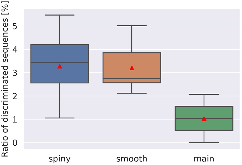 Ratio of discriminated sequences. The discriminated sequences consisted of the pulse sequences spiking in IN and OUT. Red triangles are averaged values. Note that we had only one cube for main dendrites, where stimulation started from compartment number 1,573, whereas for spiny and smooth dendrites, the cube numbers were 13 and 7, respectively.