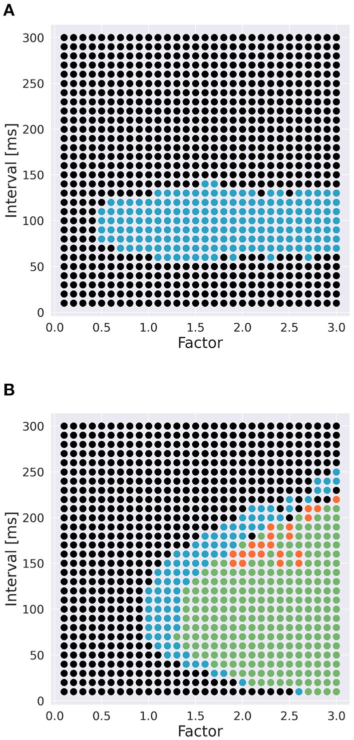 Effect of time constants of Ca2+ channels [(A): CaP channel; (B): CaT channel] and interval on sequence discrimination. Time constants were multiplied by a factor f (Figure 3). Colors are the same as in Figure 5. The number of pulses was 6, and synaptic weight was 6.633 nA.