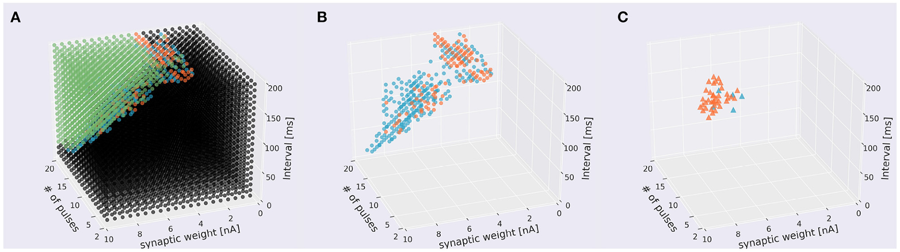 We also varied the number of pulses (i.e., the number of stimulated compartments) from 2 to 20, synaptic weights from 1 to 10 nA while changing every 0.5 nA, and interval from 10 to 200 ms while changing every 10 ms.