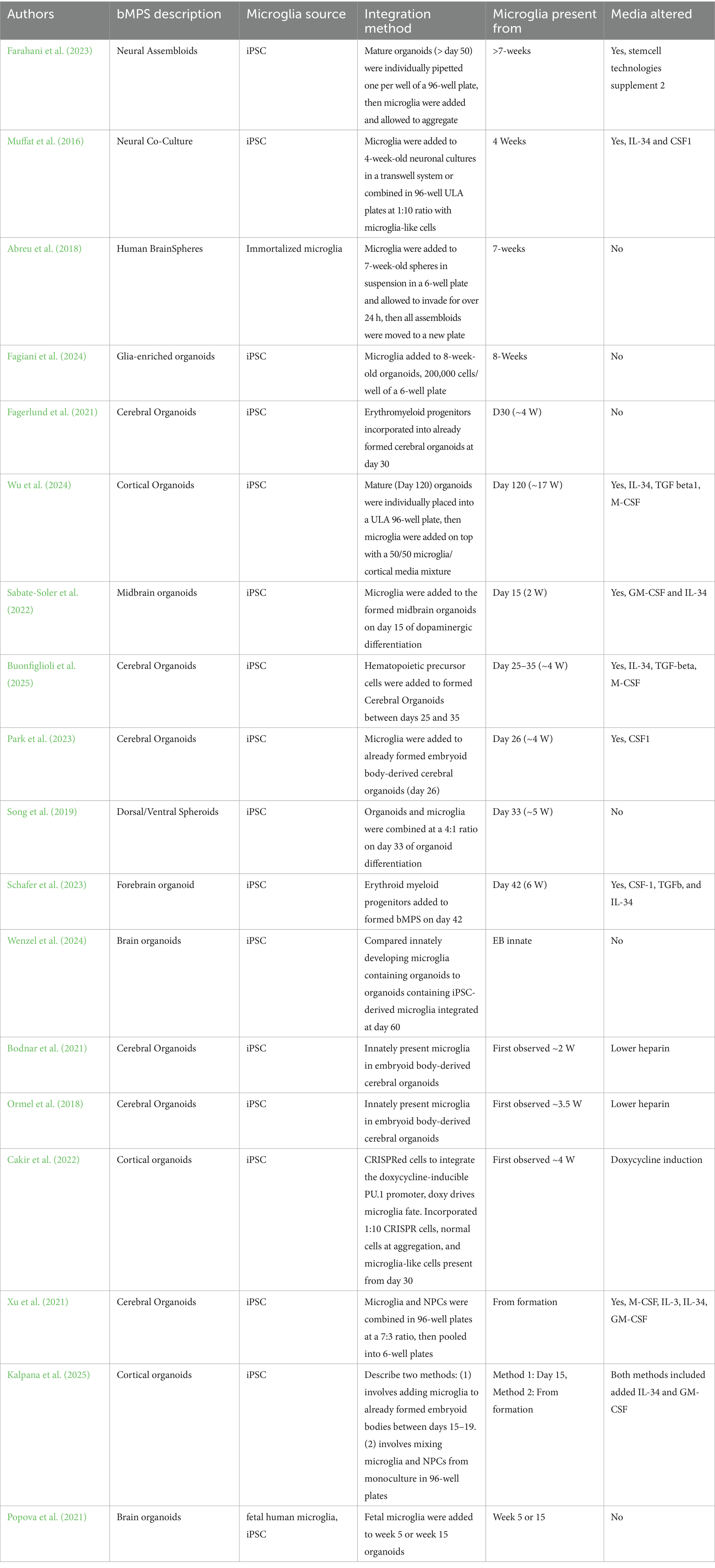 Despite the crucial role of microglia, many human-induced pluripotent stem cell (hiPSC)-derived brain organoid models lack these cells. This is because, unlike neurons, astrocytes, and oligodendrocytes—which originate from the neuroectoderm—microglia arise from the yolk sac during primitive hematopoiesis (Ginhoux et al., 2013). As a result, organoids generated solely from neuroectodermal cells inherently lack microglia. Several approaches have been developed to incorporate microglia into brain organoids, each with specific strengths and limitations (Fagiani et al., 2024; Wenzel et al., 2024; Ormel et al., 2018; Bodnar et al., 2021; Popova et al., 2021; Park et al., 2023; Sabate-Soler et al., 2022; Schafer et al., 2023; Buonfiglioli et al., 2025; Fagerlund et al., 2021; Cakir et al., 2022; Kalpana et al., 2025; Wu et al., 2024; Farahani et al., 2023; Muffat et al., 2016; Xu et al., 2021; Song et al., 2019; Abreu et al., 2018) (summarized and compared in Table 1; Supplementary Figure S1). Among these, co-culturing microglia with neural progenitors provides the most reproducible approach for forming 3D cultures. However, published protocols typically require microglia-specific factors or media, or they fail to maintain microglia throughout the entire culture period.
