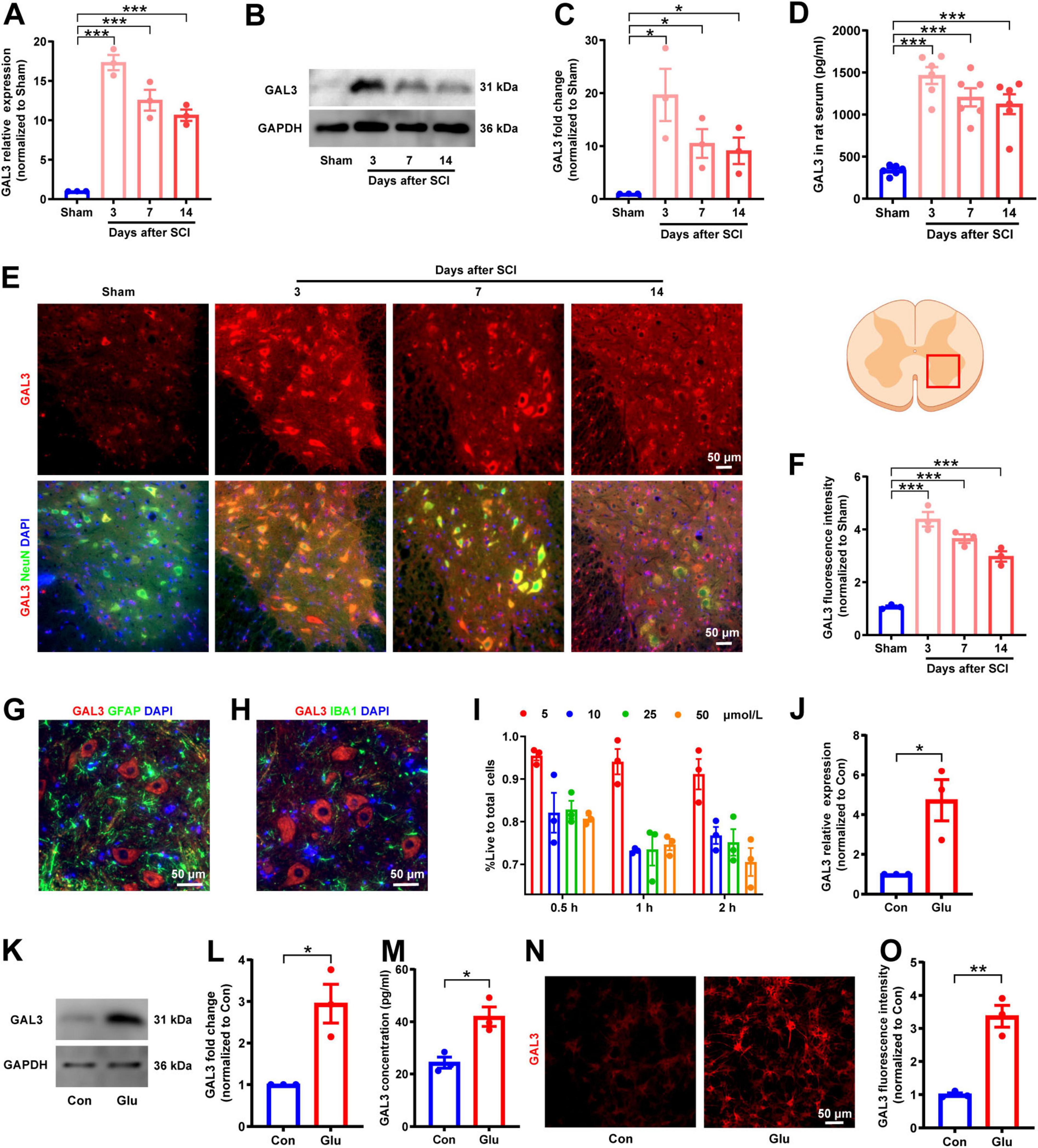Figure 1. Spinal cord injury (SCI) increases galectin-3 (GAL3) expression in spinal neurons. (A) Relative GAL3 mRNA expression in the spinal cord after SCI. One-way ANOVA, n = 3/group. (B) Western blot analysis of GAL3 protein after SCI. (C) Statistical data show relative GAL3 protein expression after SCI. One-way ANOVA, n = 3/group. (D) Enzyme-linked immunosorbent assay (ELISA) detection of GAL3 protein levels in rat serum after SCI. One-way ANOVA, n = 6/group. (E) Immunofluorescence microscopy reveals GAL3 co-localization with NeuN post-SCI. (F) Fluorescence intensity of GAL3 after SCI. One-way ANOVA, n = 3/group. (G,H) Immunofluorescence double staining of GAL3 and GFAP (G) or IBA1 (H) after SCI. (I) Determination of optimal glutamate concentration and duration using CCK8 assay. (J) Relative GAL3 mRNA expression in the glutamate-stimulated spinal cord neurons. Unpaired Student’s t-test, n = 3/group. (K) Western blot analysis of GAL3 protein in neuronal injury model. (L) Relative GAL3 protein expression in neuronal injury model. Unpaired Student’s t-test, n = 3/group. (M) ELISA detection of GAL3 in cell supernatant of neuronal injury model. Unpaired Student’s t-test, n = 3/group. (N) Immunofluorescence microscopy showing GAL3 expression in neuronal injury model. (O) Quantification of GAL3 fluorescence intensity in neuronal injury model. Unpaired Student’s t-test, n = 3/group. *P < 0.05, **P < 0.01, ***P < 0.001.