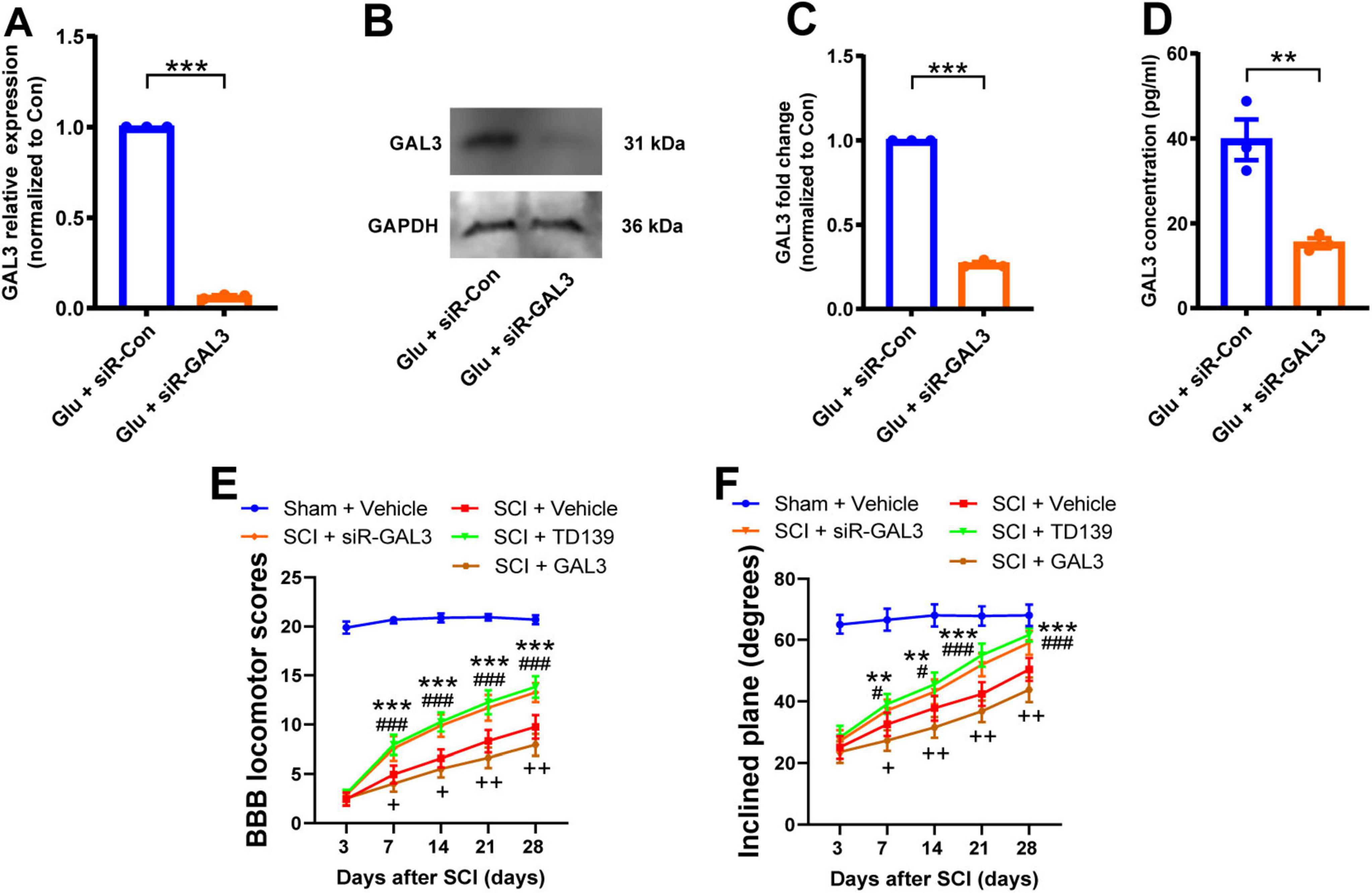 Figure 2. Galectin-3 (GAL3) contributes to spinal cord injury (SCI)-induced motor impairment. (A) The mRNA level of GAL3 after siR-GAL3 treatment. Unpaired Student’s t-test, n = 3/group. (B) Western blot shows the protein level of GAL3 after siR-GAL3 treatment. (C) Statistical data show the knockdown of GAL3 by siRNA. Unpaired Student’s t-test, n = 3/group. (D) Enzyme-linked immunosorbent assay (ELISA) shows the secretory GAL3 in the supernatant of neurons after siRNA treatment. Unpaired Student’s t-test, n = 3/group. (E) The Basso-Beattie-Bresnahan (BBB) locomotor scores were increased after siR-GAL3 or inhibitor treatment. Two-way Repeated Measures ANOVA, n = 8/group. (F) The inclined plane angles were increased after siR-GAL3 or inhibitor treatment. Two-way Repeated Measures ANOVA, n = 8/group. When SCI + siR-GAL3 group was compared with SCI + Vehicle group, **P < 0.01, ***P < 0.001; when SCI + TD139 group was compared with SCI + Vehicle group, #P < 0.05, ###P < 0.001; when SCI + GAL3 group was compared with SCI + Vehicle group, +P < 0.05,++P < 0.01.