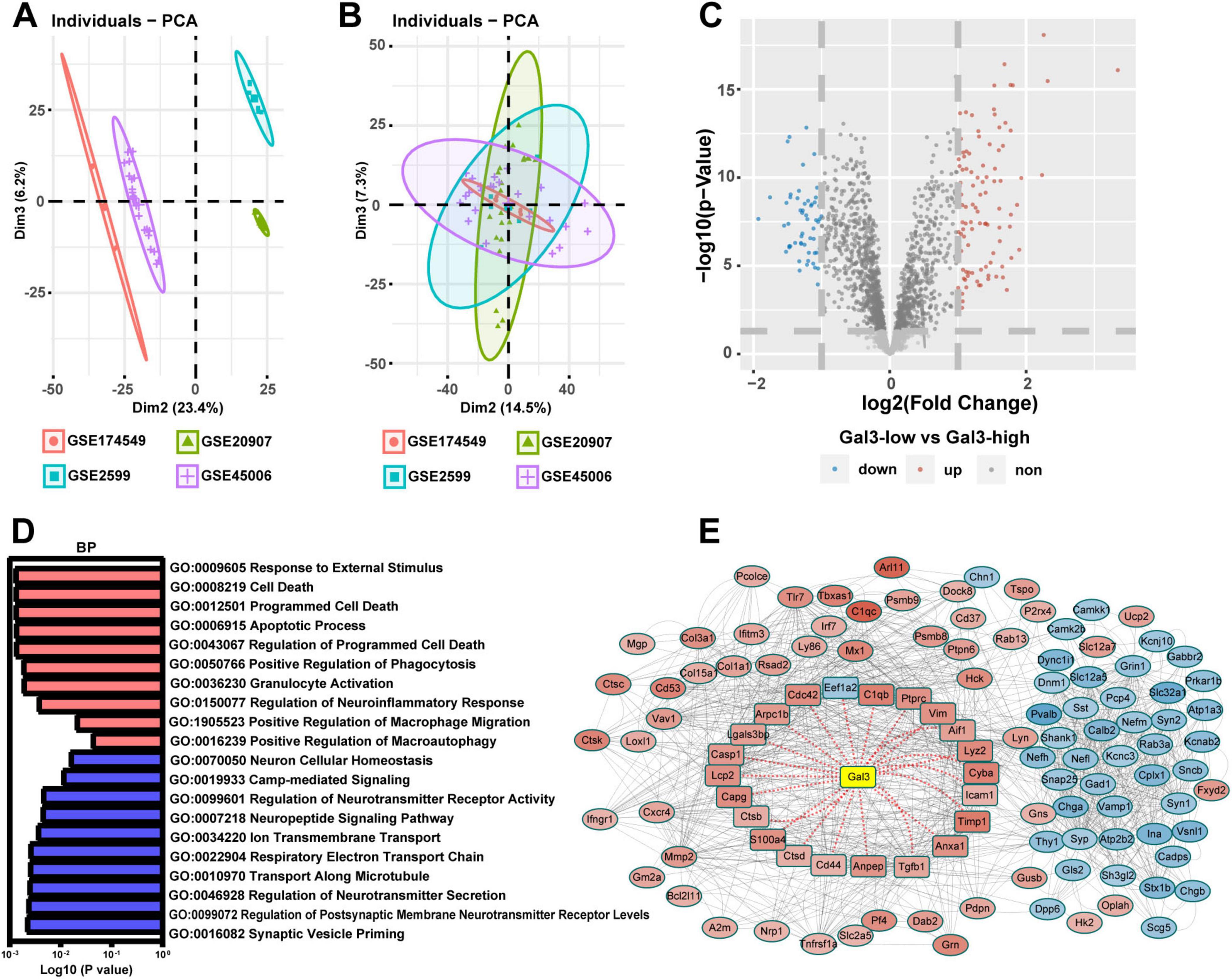 Figure 3. Galectin-3 (GAL3) is closely related to programmed cell death after spinal cord injury (SCI). (A) The four datasets before the batch effect were removed. (B) The four datasets after the batch effect were removed. (C) Volcano map shows DEGs in the SCI dataset. (D) Biological Process (BP) analysis of Gene Set Enrichment Analysis (GSEA) in the SCI dataset. Each column represents the P-value score of the pathway between the Sham group and the SCI group, with red indicating upregulation of the pathway in the SCI group, and blue indicating downregulation. (E) Protein-Protein Interaction Networks (PPI) analysis of differentially expressed genes (DEGs) in SCI dataset. In the PPI nodes, red signifies an increase in expression level, while blue indicates a decrease. The intensity of the color corresponds to the magnitude of the differential expression, with darker shades representing a higher differential expression multiple.