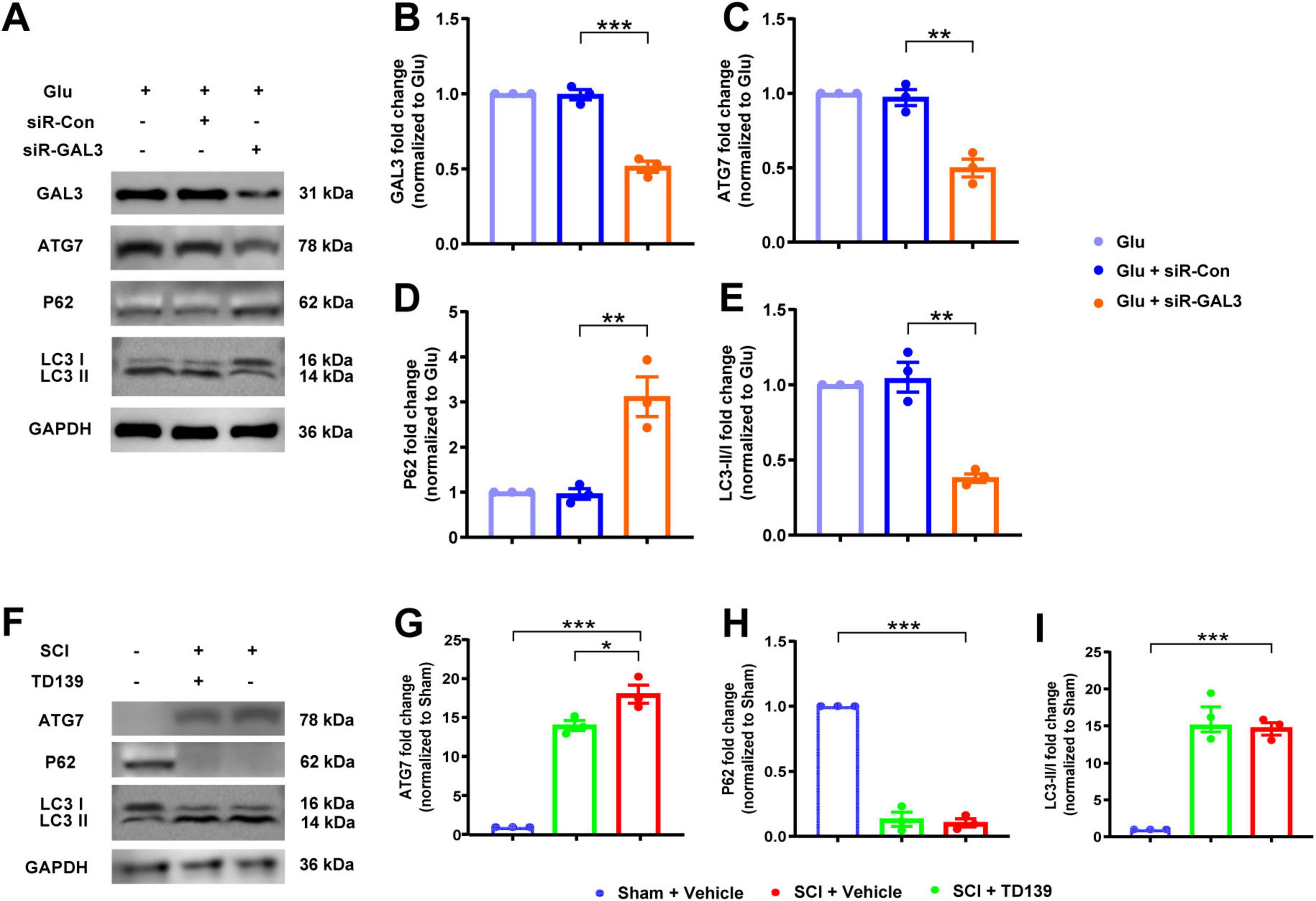 Considering the pivotal role of autophagy in programmed cell death, we validated whether GAL3 functions through autophagy after SCI. Initially, we used glutamate to stimulate neurons treated by siR-GAL3 (Figure 4A). In comparison with the siR-Con group, the siR-GAL3 group displayed significantly reduced GAL3 expression (Figure 4B), decreased ATG7 expression (Figure 4C), increased P62 expression (Figure 4D), and a decreased LC3 II/I ratio (Figure 4E).